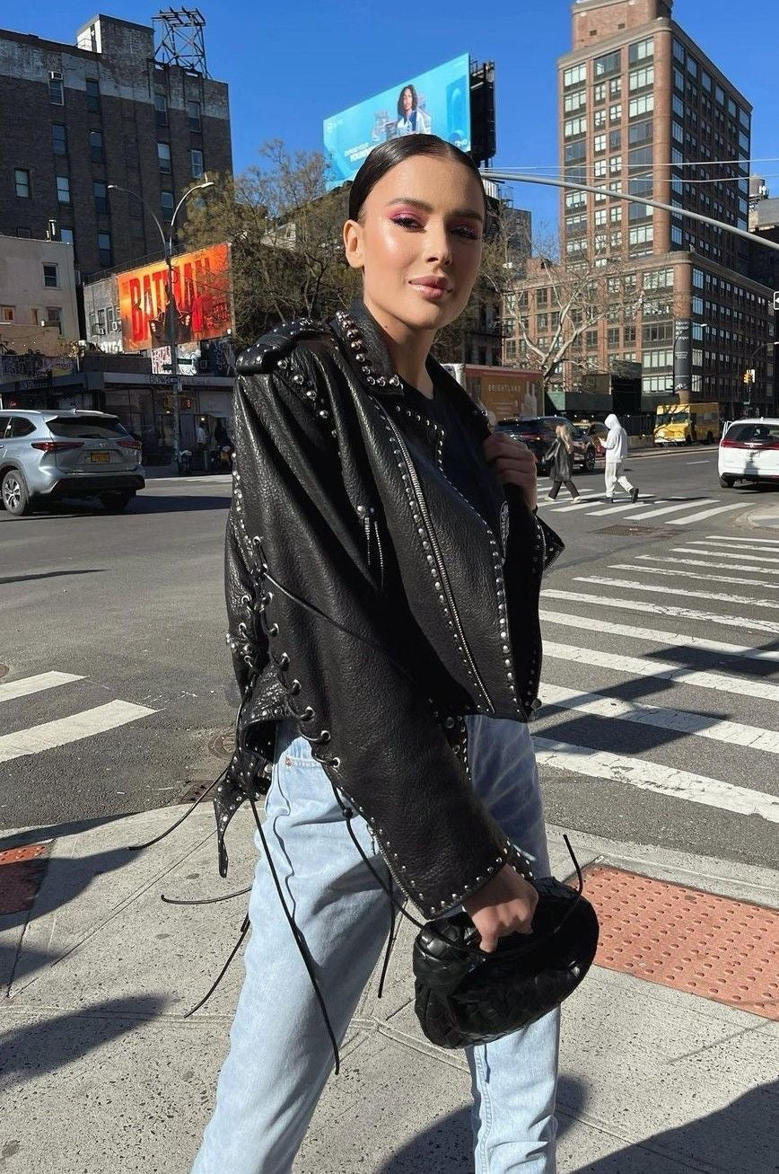 Playful meets bold in this statement moto jacket covered in silver heart-shaped studs. A daring take on the classic biker, it brings a feminine edge to rock-chic styling — perfect for nights out or standout street looks.