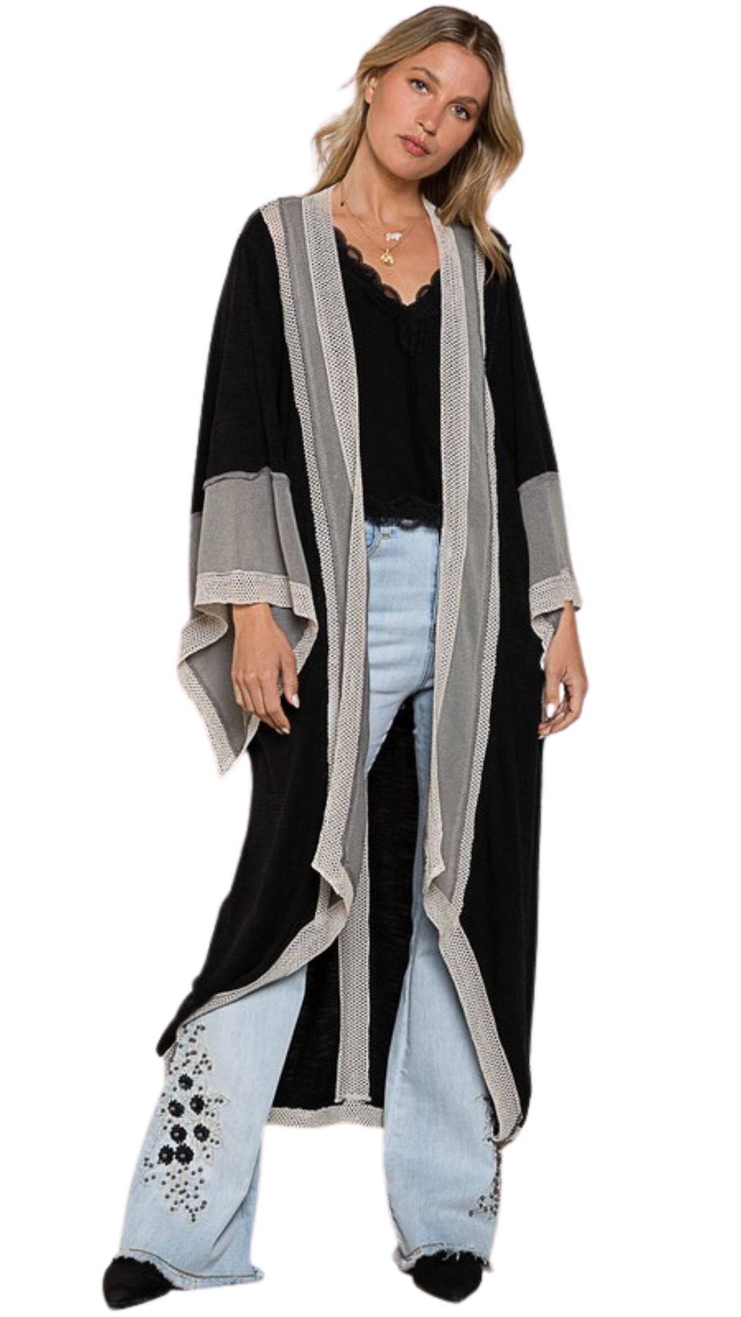Unleash your summer style with our versatile Black Cotton Kimono, featuring chic grey borders for a touch of elegance. Whether worn as a top or over a swimsuit, this piece transitions seamlessly from day to night. With its mix of knit, solid, and netted grey borders, it's the perfect blend of comfort and sophistication for warm-weather adventures.