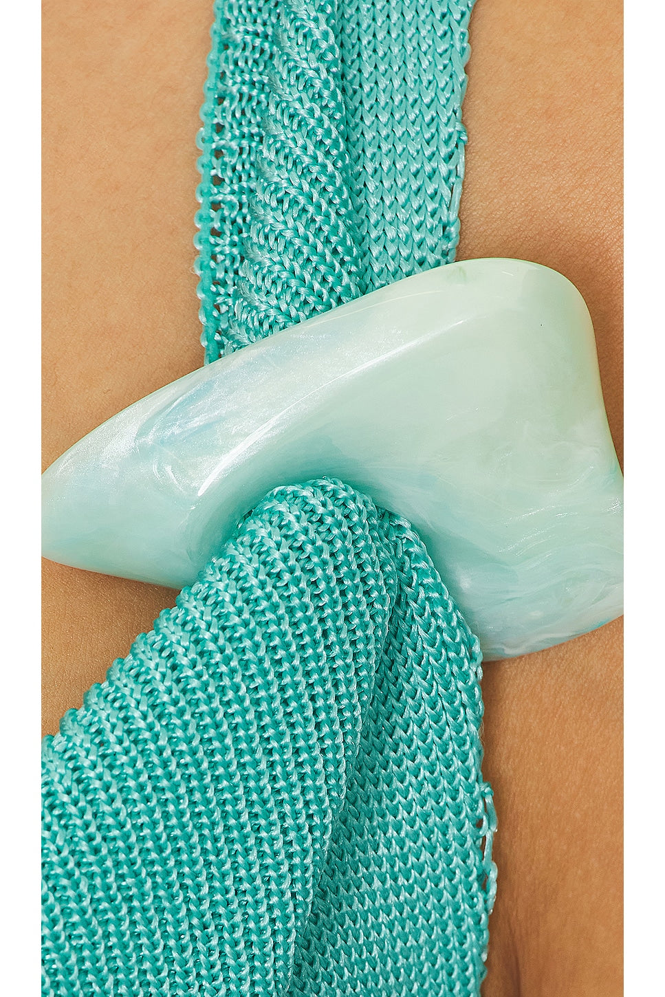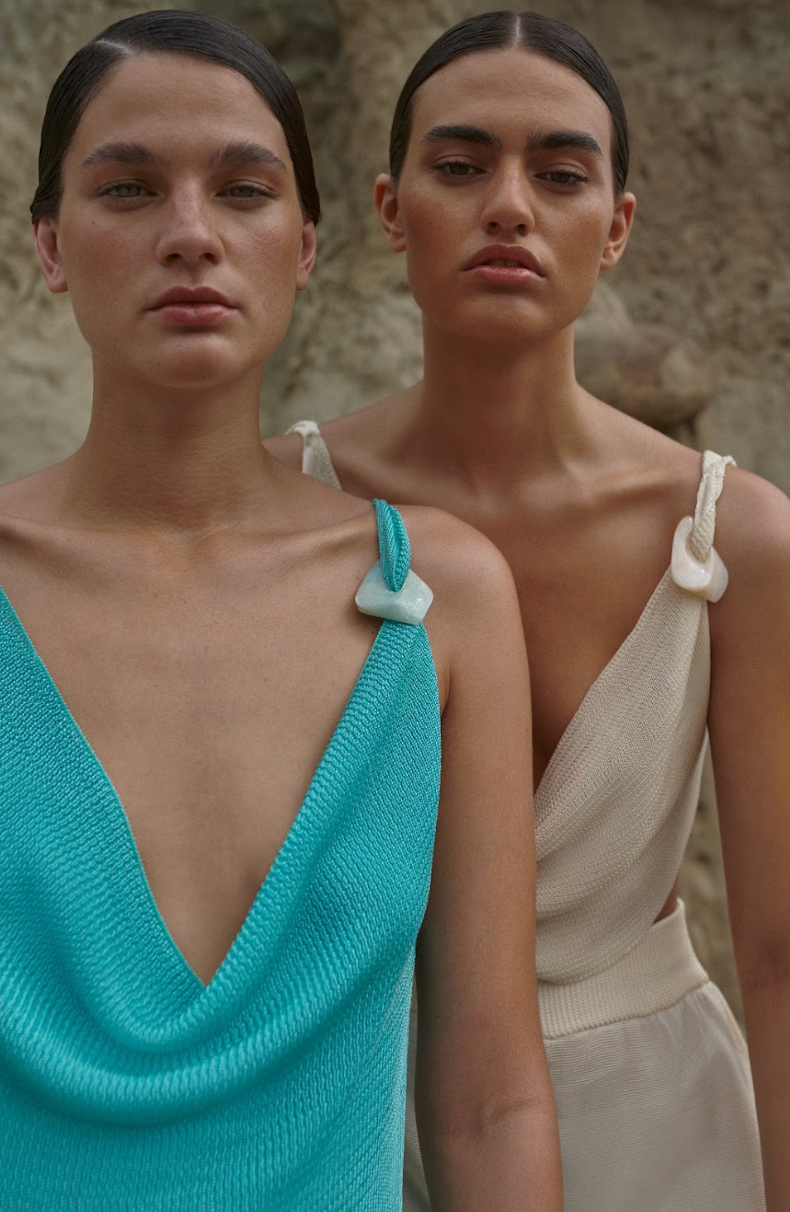 Introducing the "Sarai Dress" in Espejo - This knitted maxi dress is sustainably crafted with a lightweight fabric that draws inspiration from the serene shades of the ocean. It features the distinctive Baobab shape on one shoulder strap and a deep scoop neckline. It has a silver color block detail at the bottom to add a touch of uniqueness to your look.