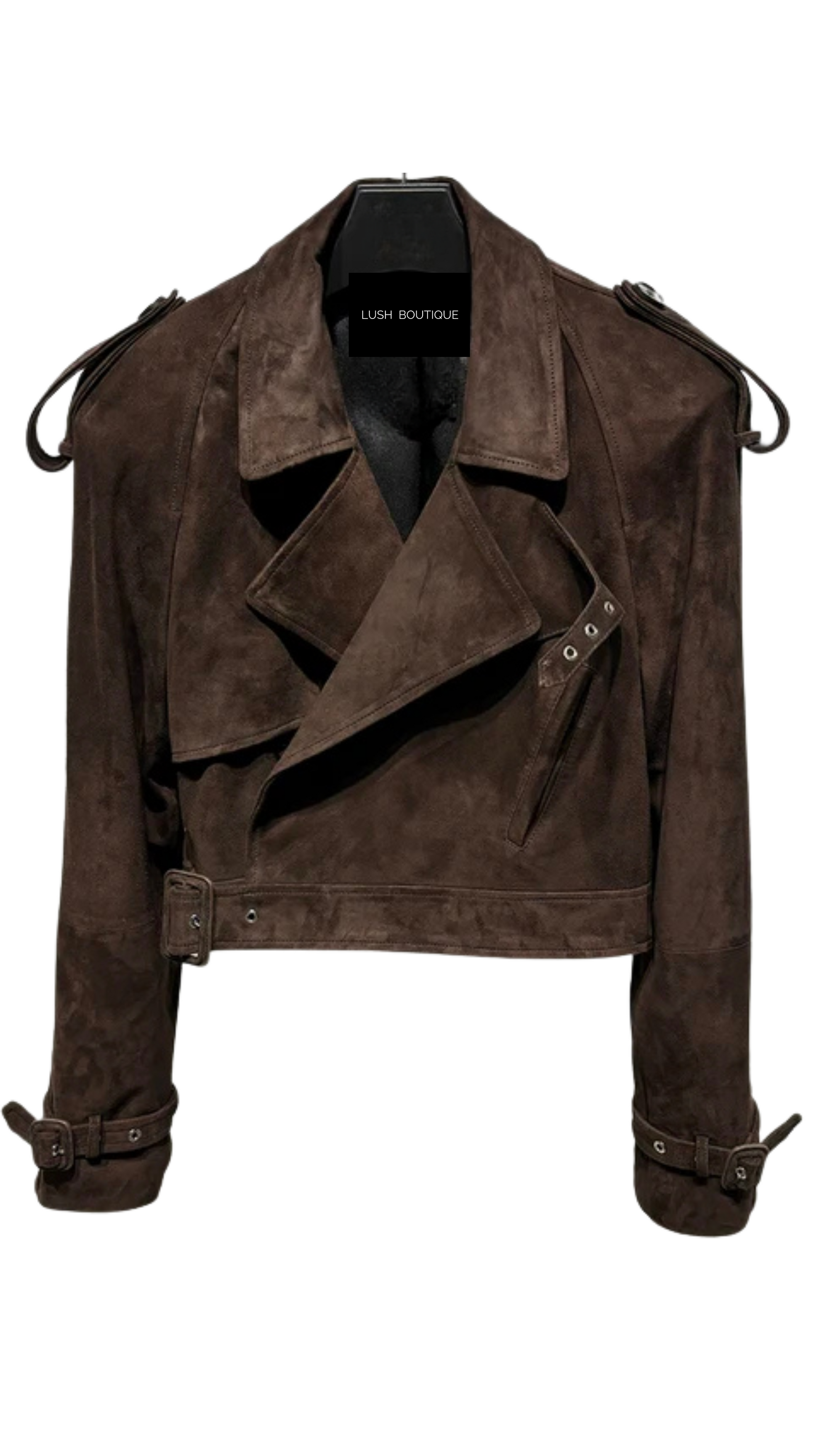Our signature brown suede leather jacket is crafted from genuine lambskin leather. Features an iconic slim straight and cropped cut, double breasted design, leather buttons fastening and leather belt for a defined waistline.