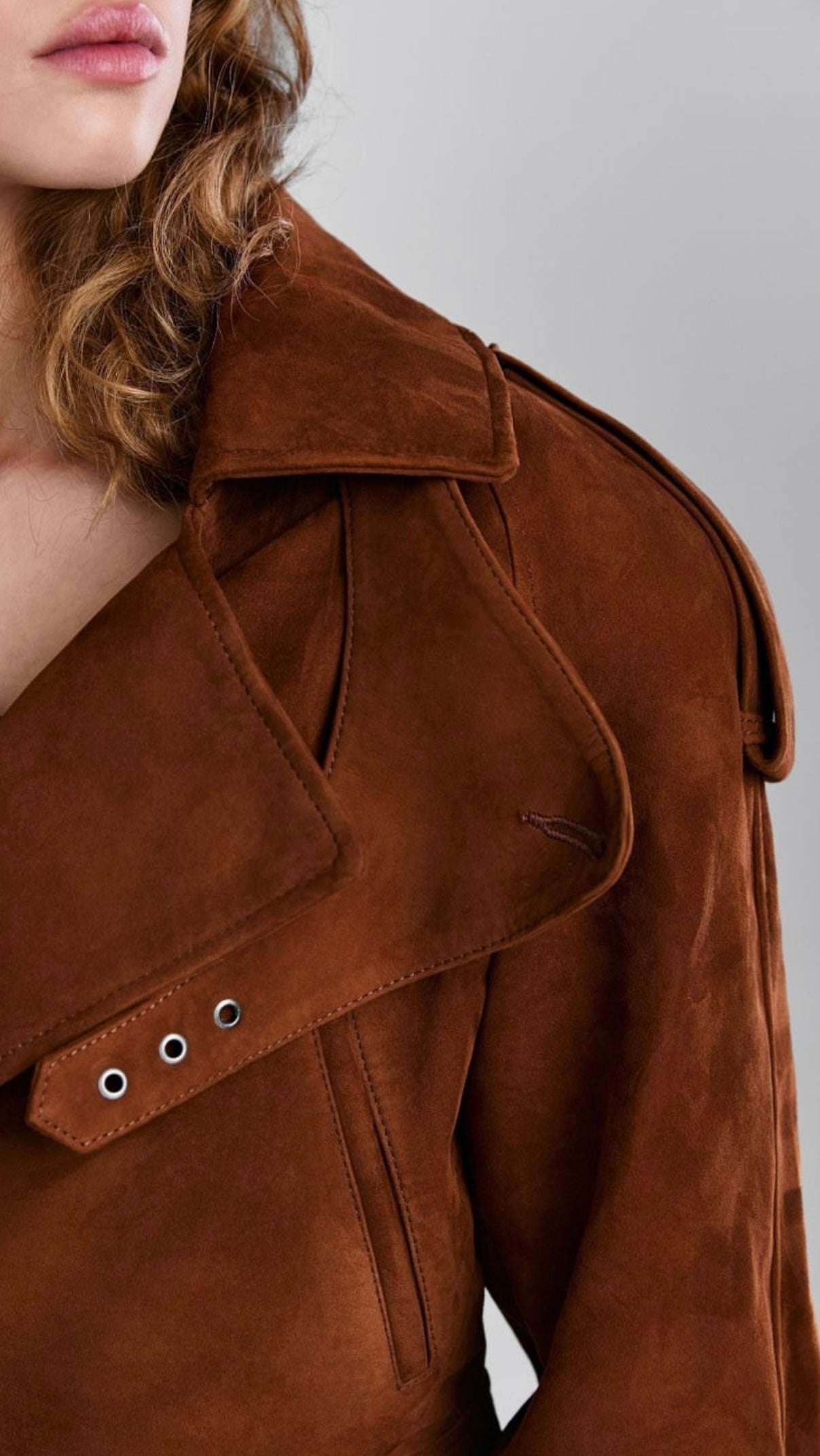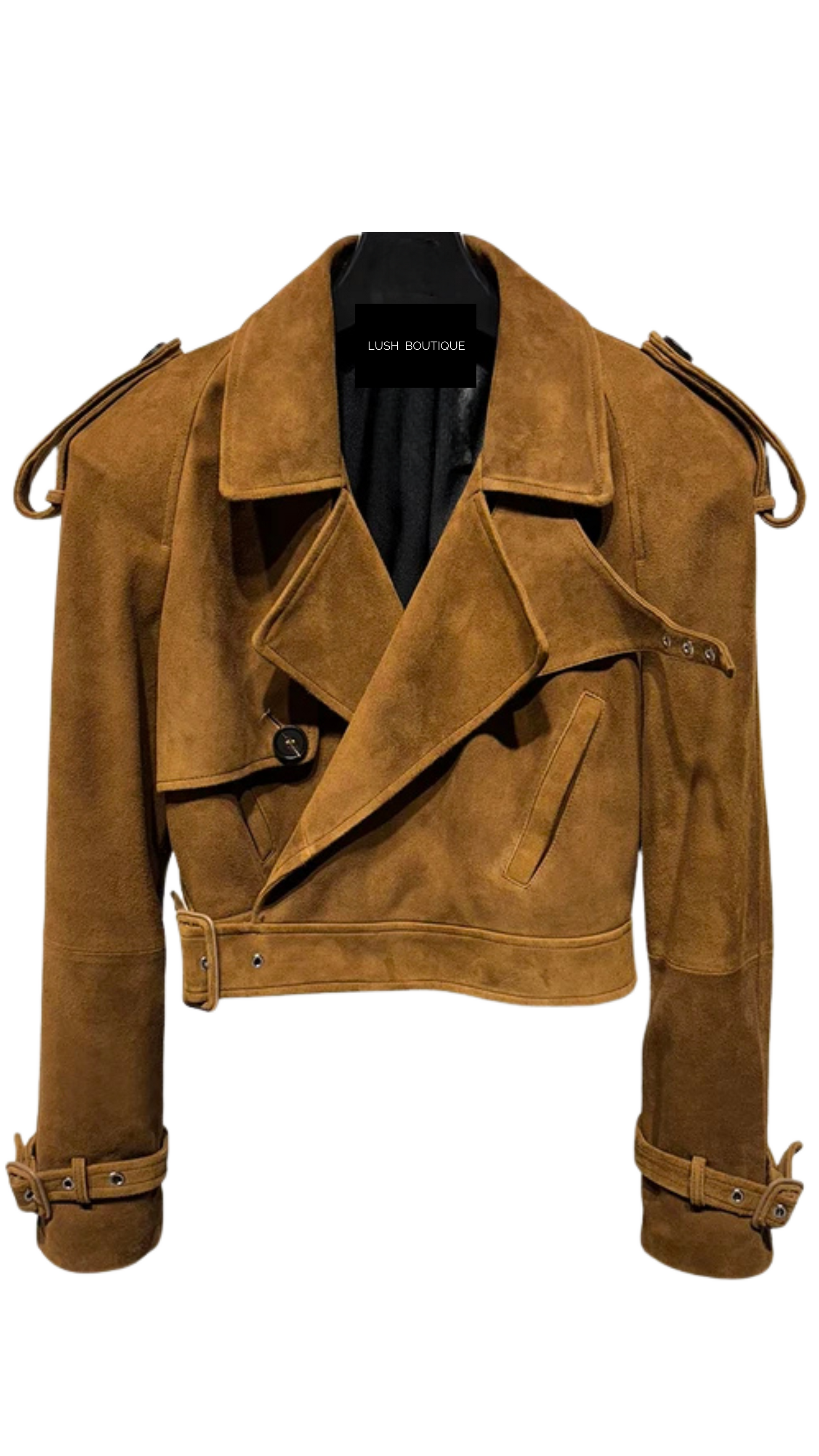 Our signature camel suede leather jacket is crafted from genuine lambskin leather. Features an iconic slim straight and cropped cut, double breasted design, leather buttons fastening and leather belt for a defined waistline.