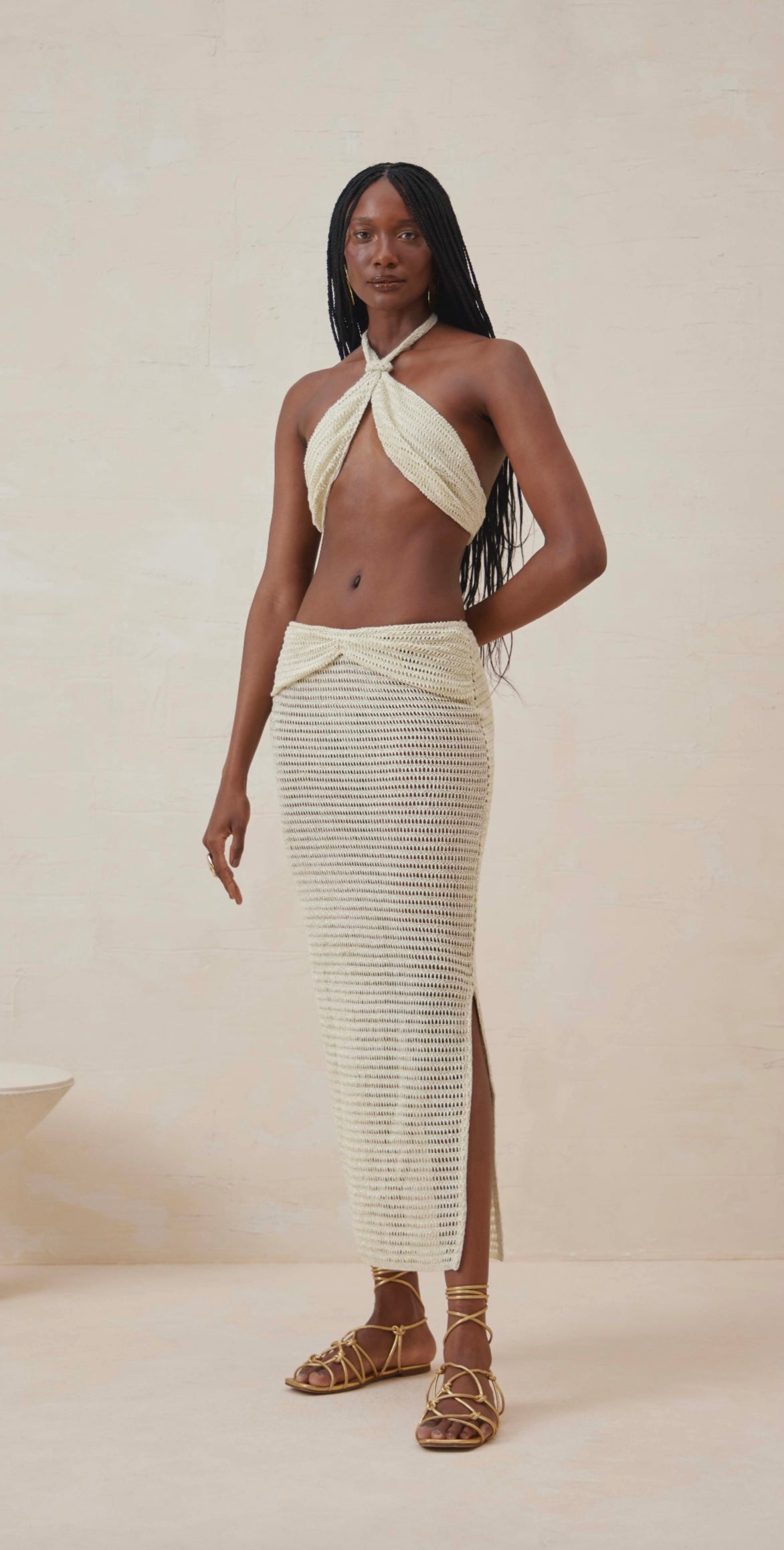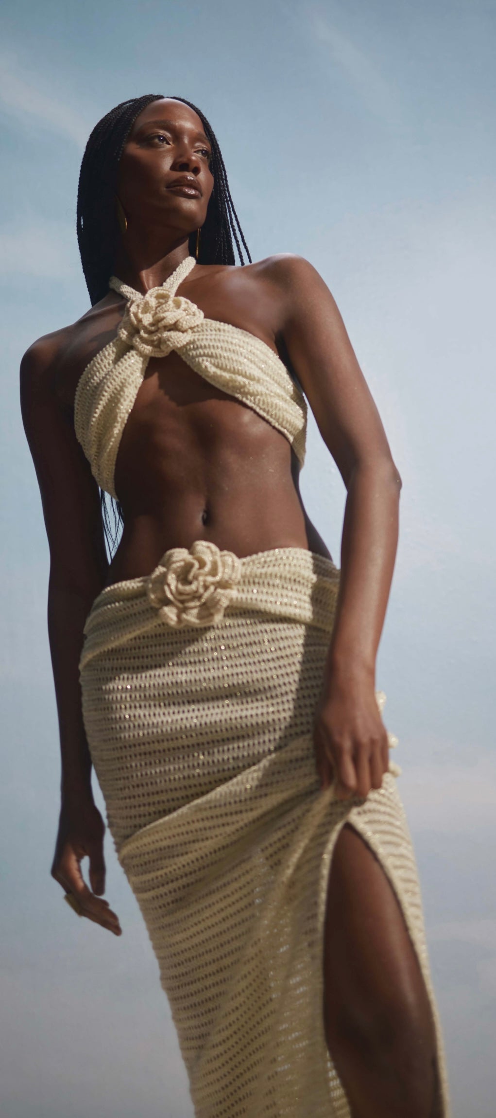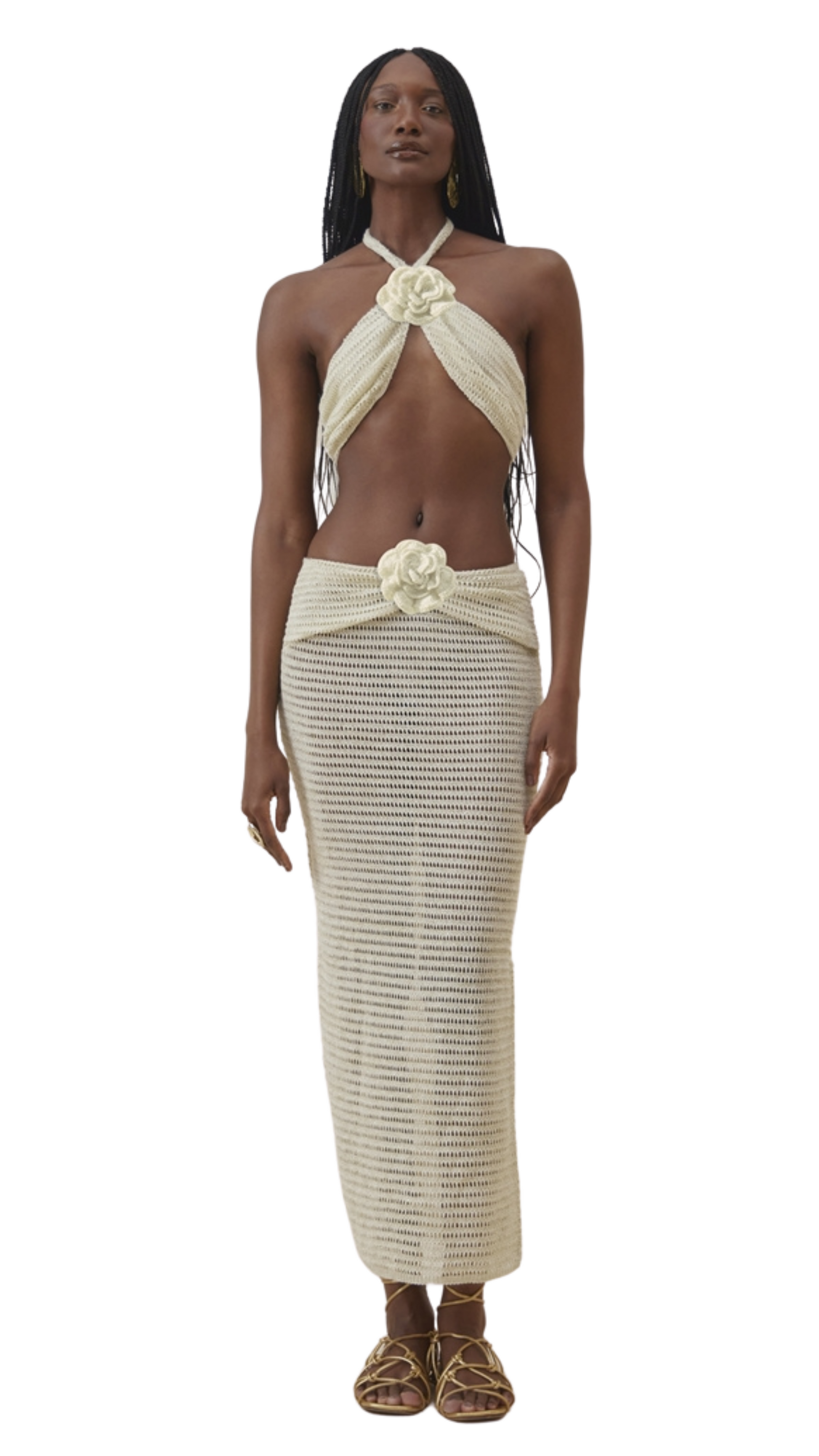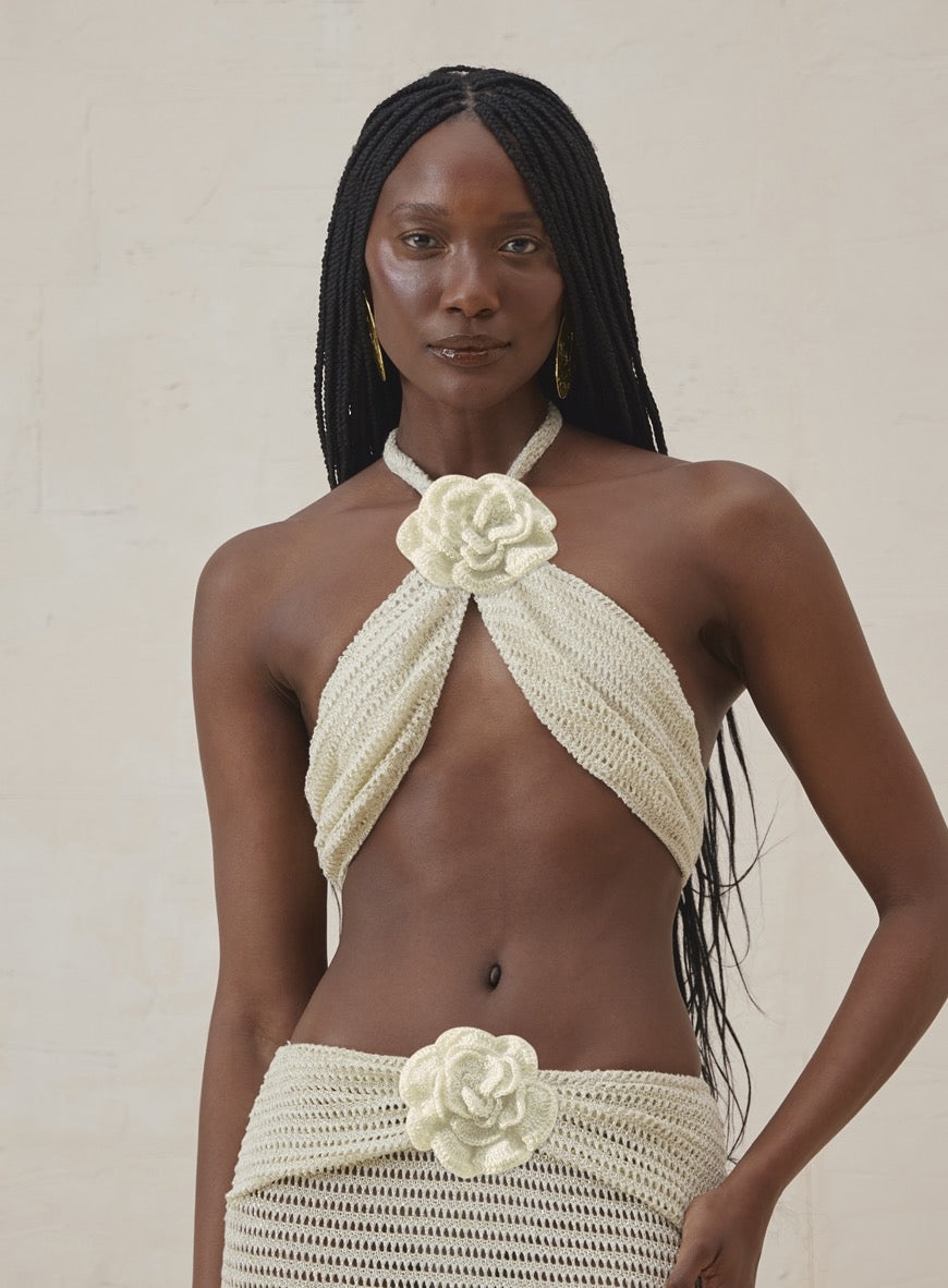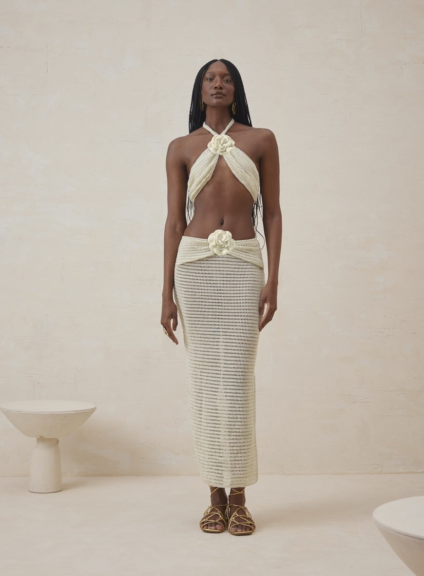 Top and Skirt Knit Set MarianaThe Top and Skirt Knit Set Mariana is an elegant and sophisticated option for various occasions. The top features a slim cut, flower detailing, halter neckline, and cropped length, providing a modern and stylish look.The skirt boasts a straight cut and slim fit, crafted from lace fabric with transparency, low waist, flower detailing, and a simple finished hem. Combining comfort and style, this set is perfect for those seeking a refined and personality-filled ensemble.