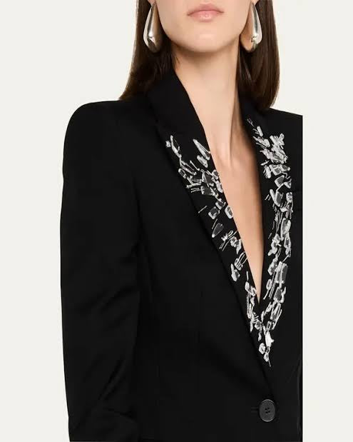 - Peak lapels hand-embroidered with jagged crystal and metal embellishments