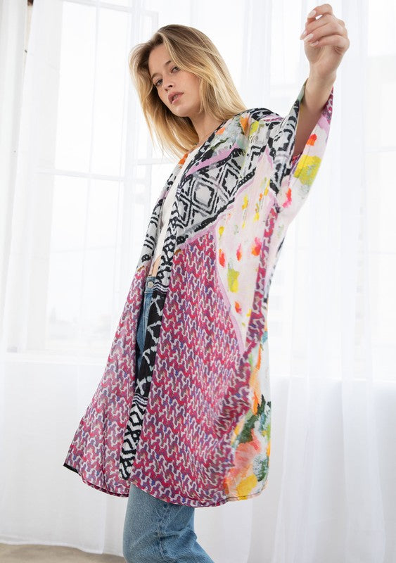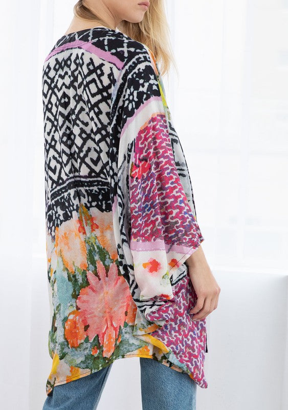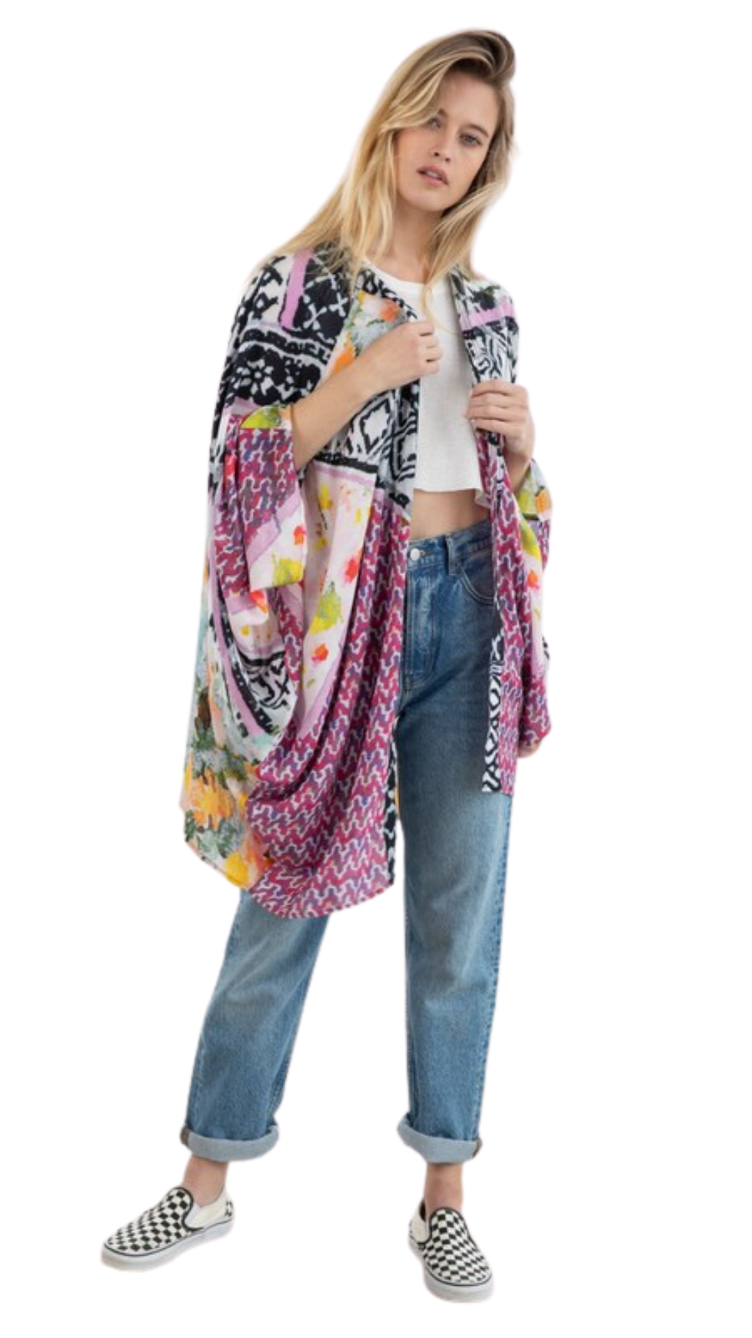 Ultra bohemian cocoon open front kimono. Features classic short kimono sleeves andan abstract floral and geometric print. Can be dressed up or dressed down.