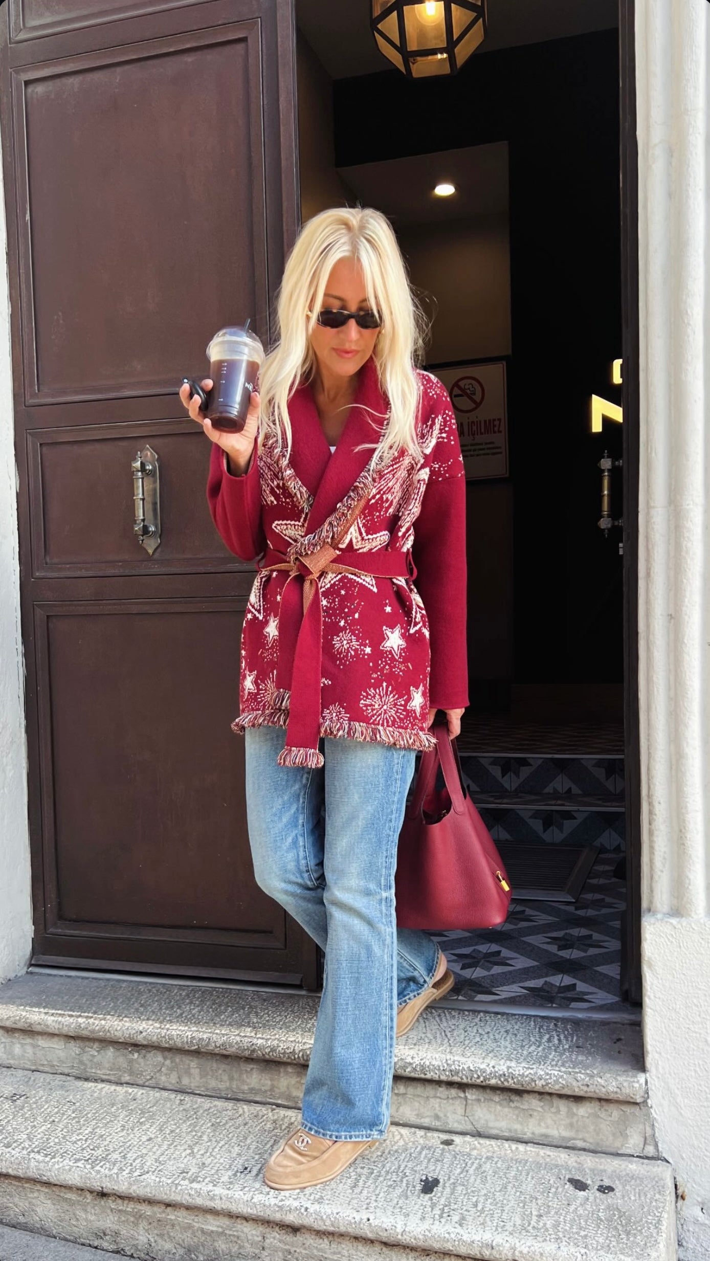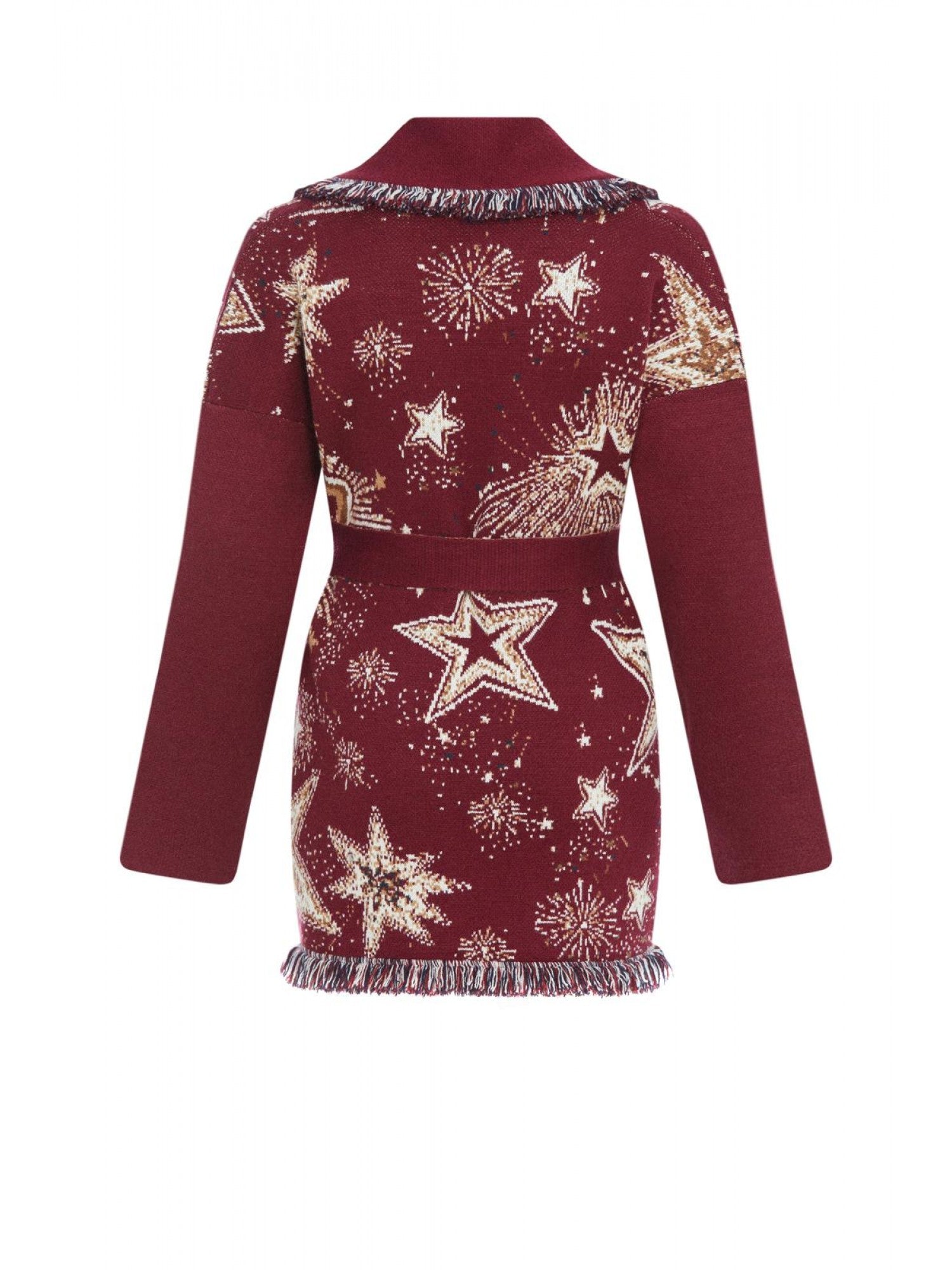 Fringed & belted jacquard cardigan