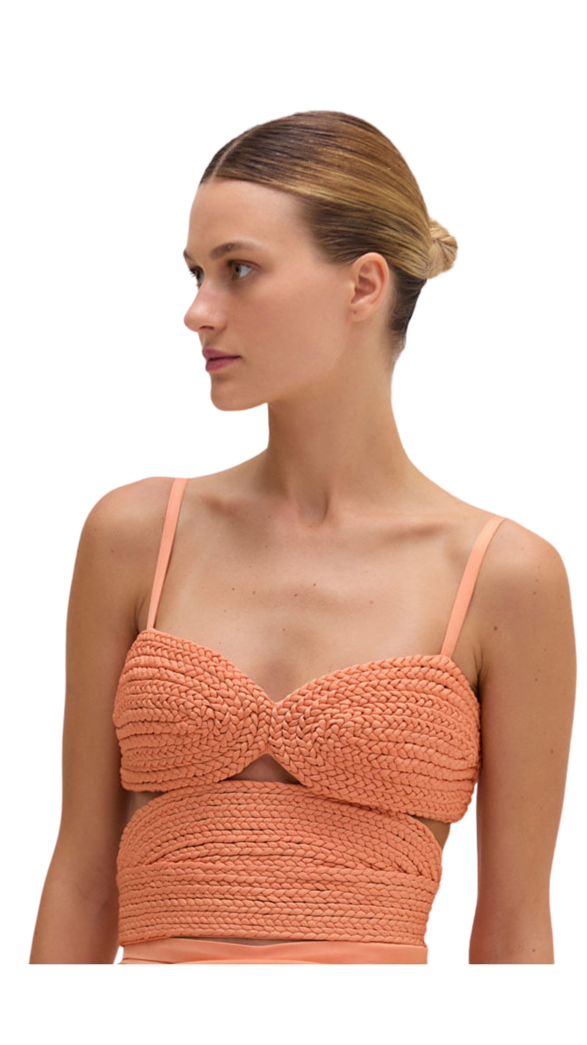 Top made of satin with lining, has bust and body with applied braids, back with cutout, thin adjustable straps, closure with detachable metal zipper and cross tie at the back.