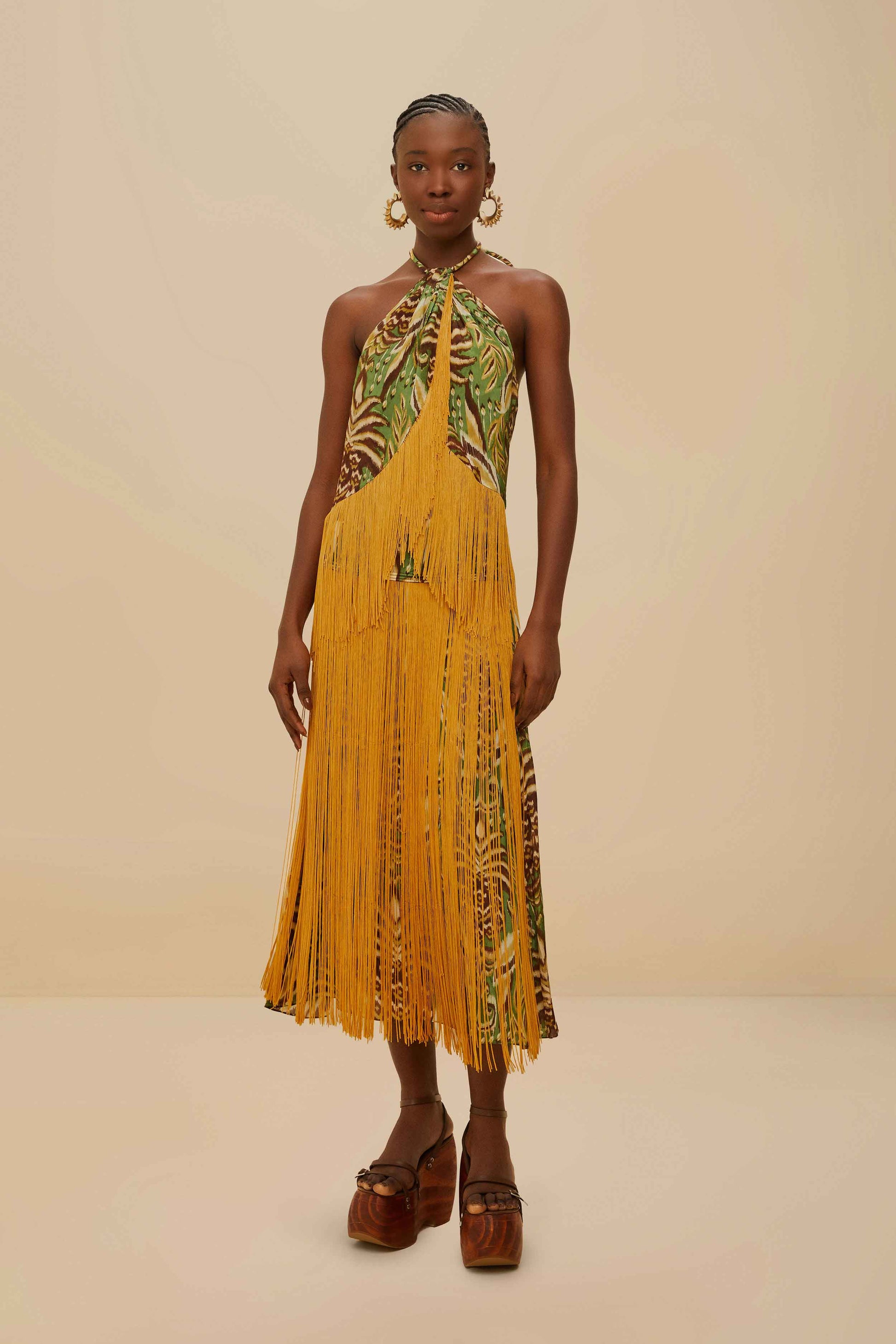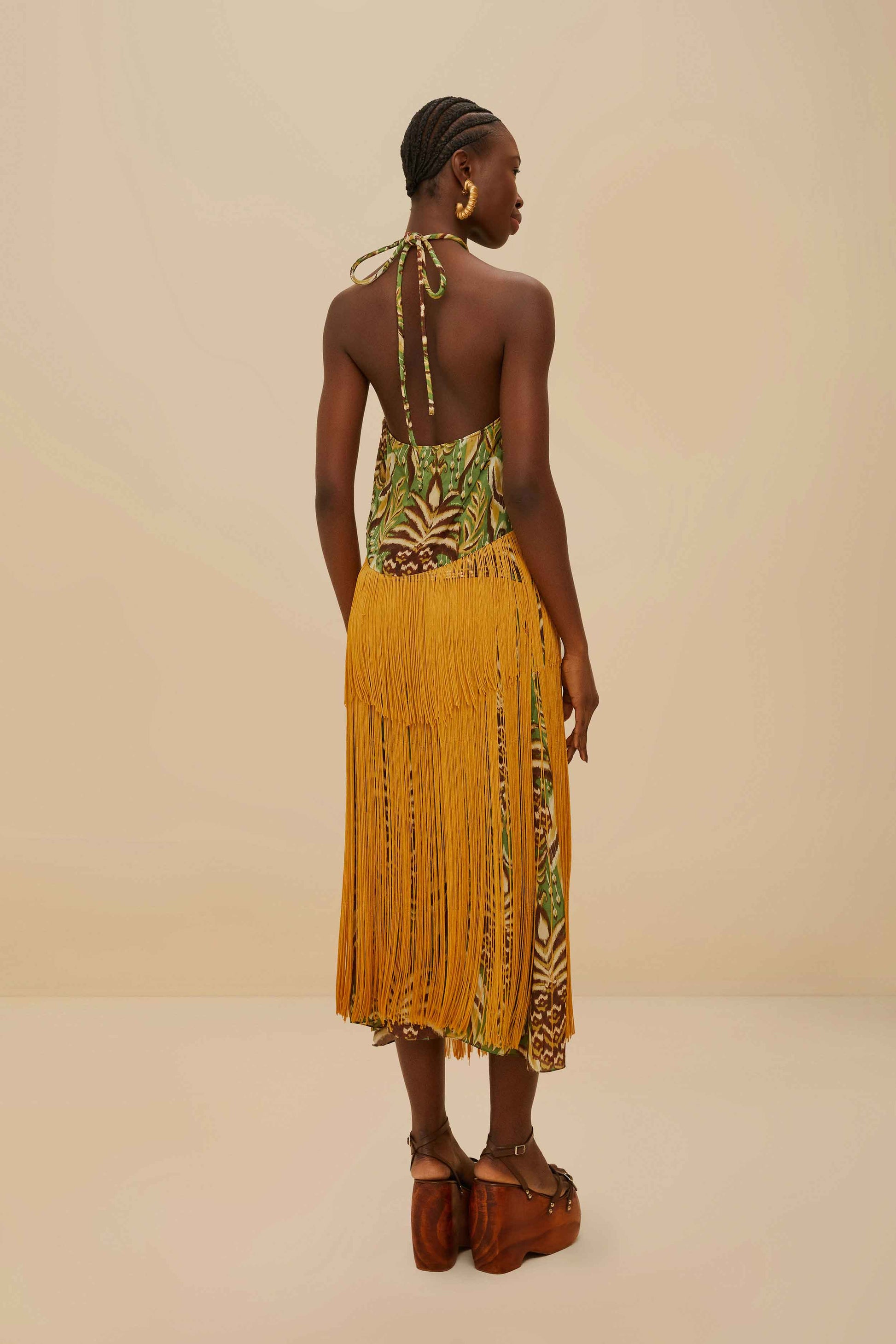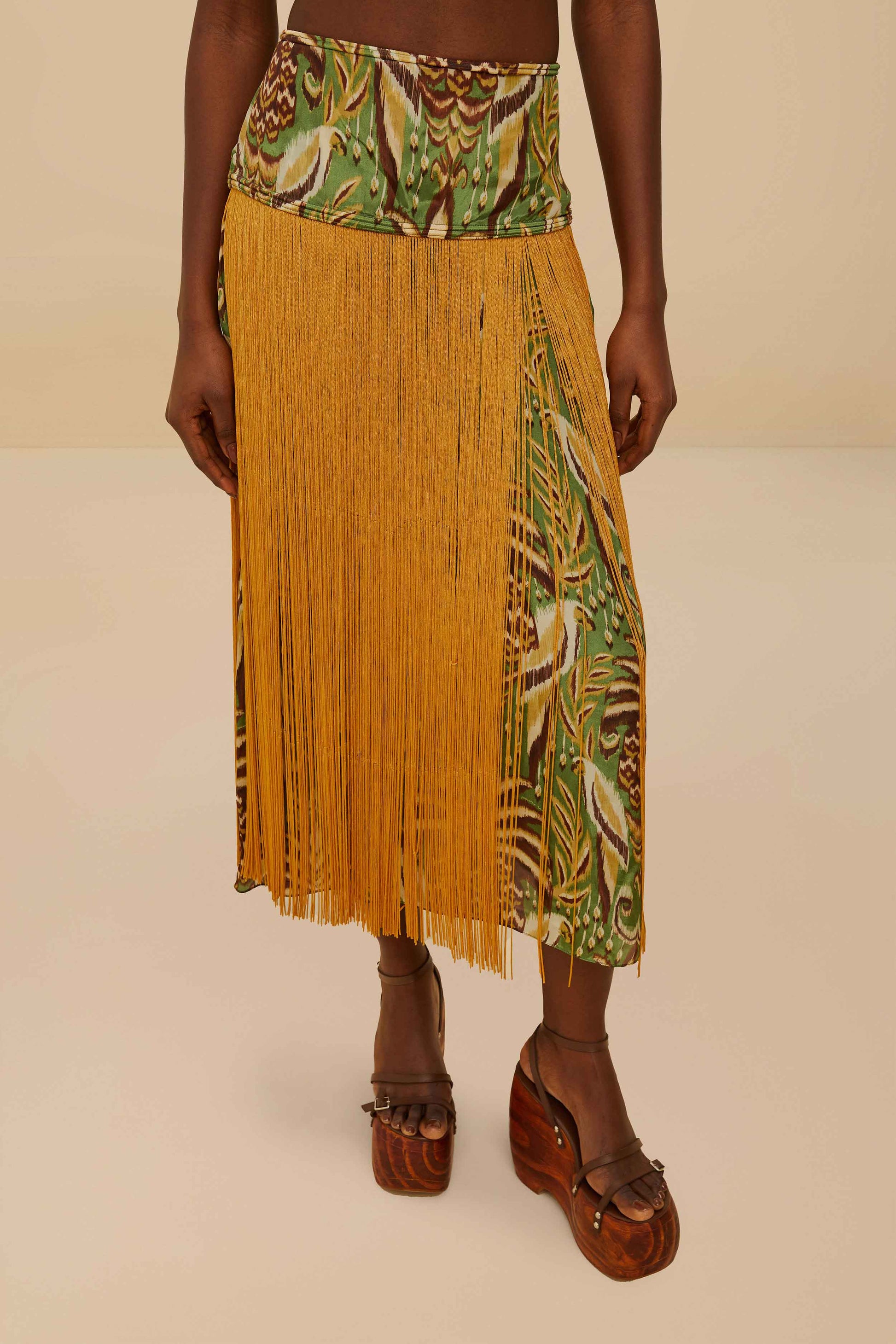 The Pineapple Tapestry Green Fringe Midi Skirt