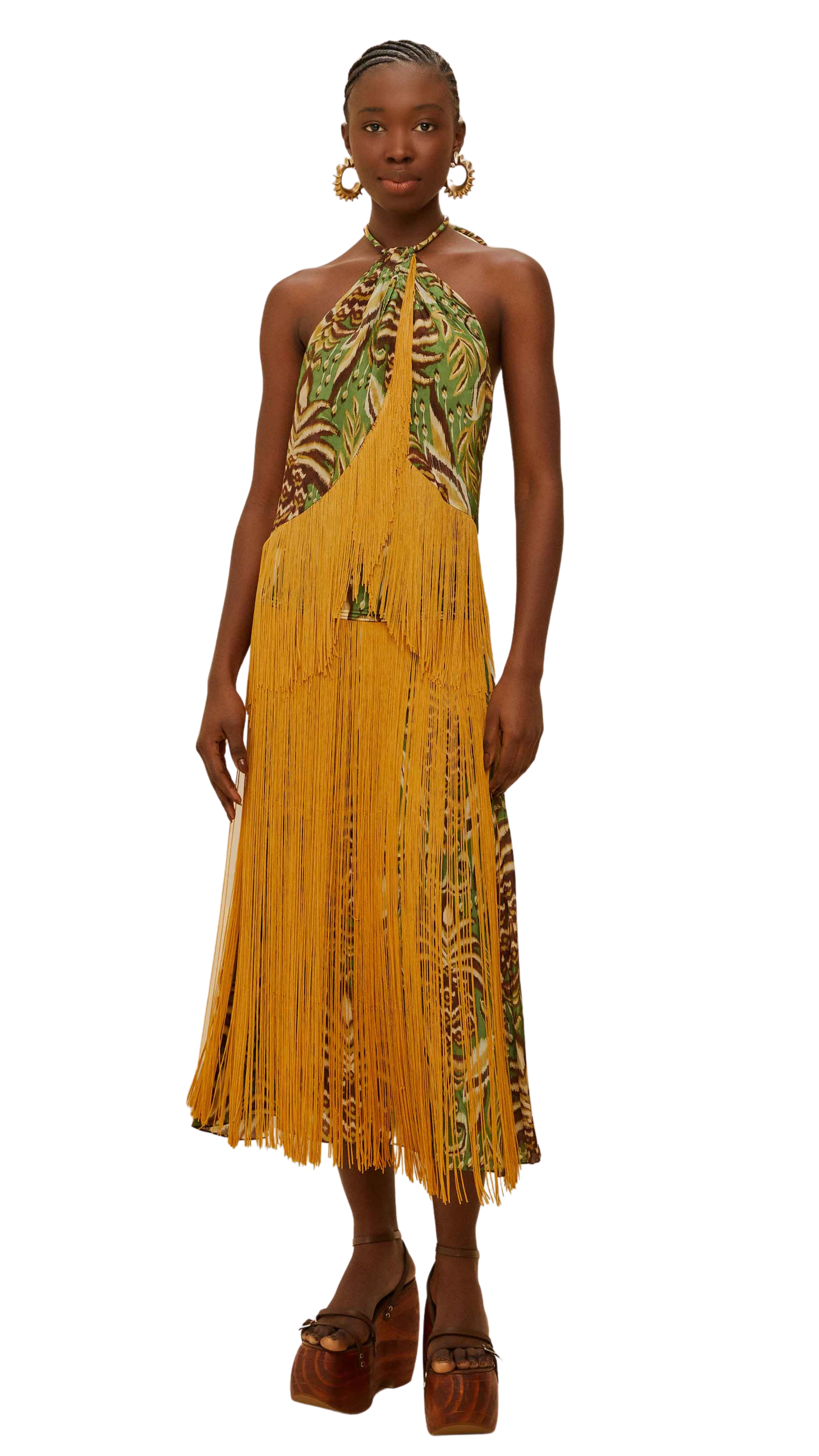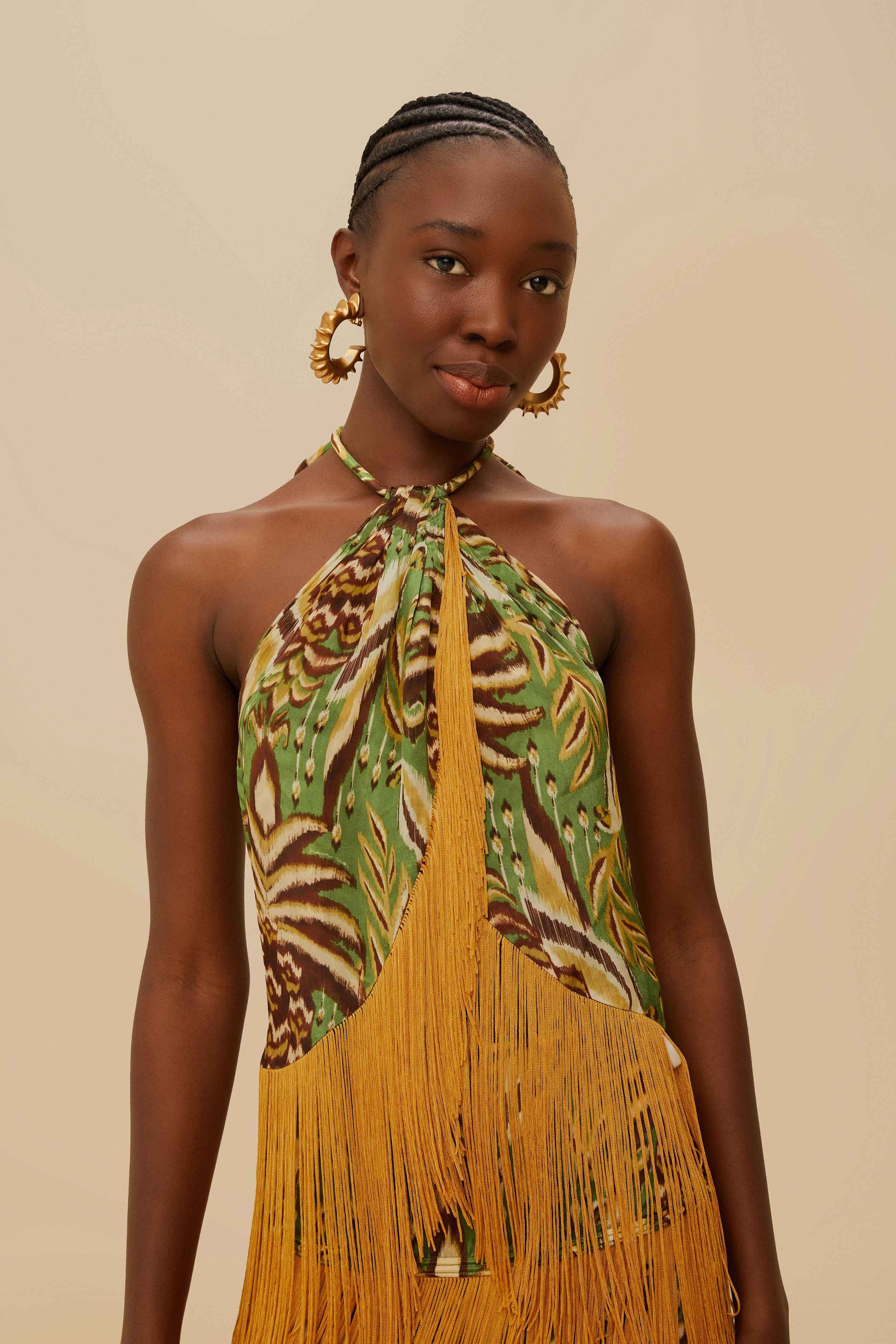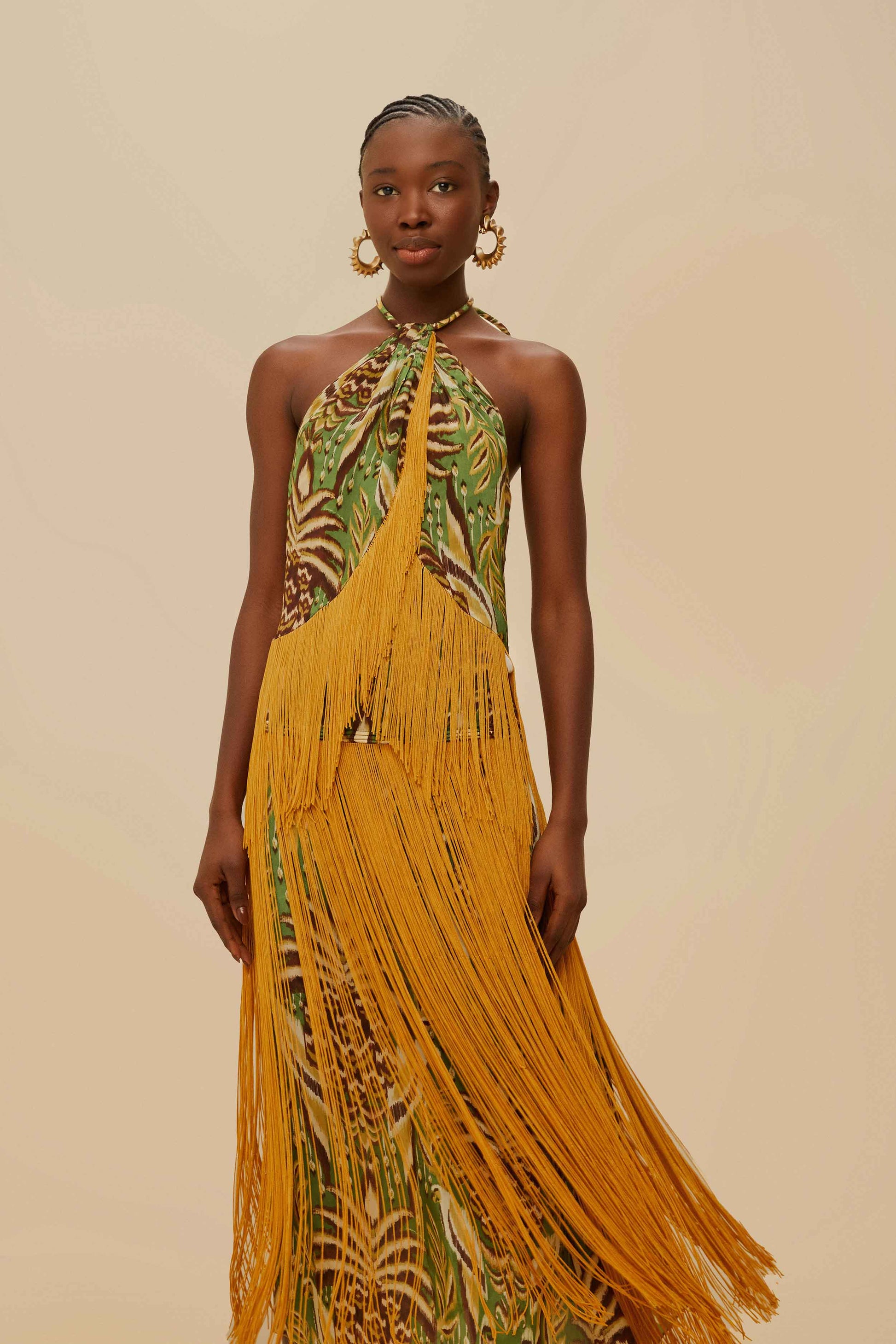 The Pineapple Tapestry Green Fringe Midi Skirt