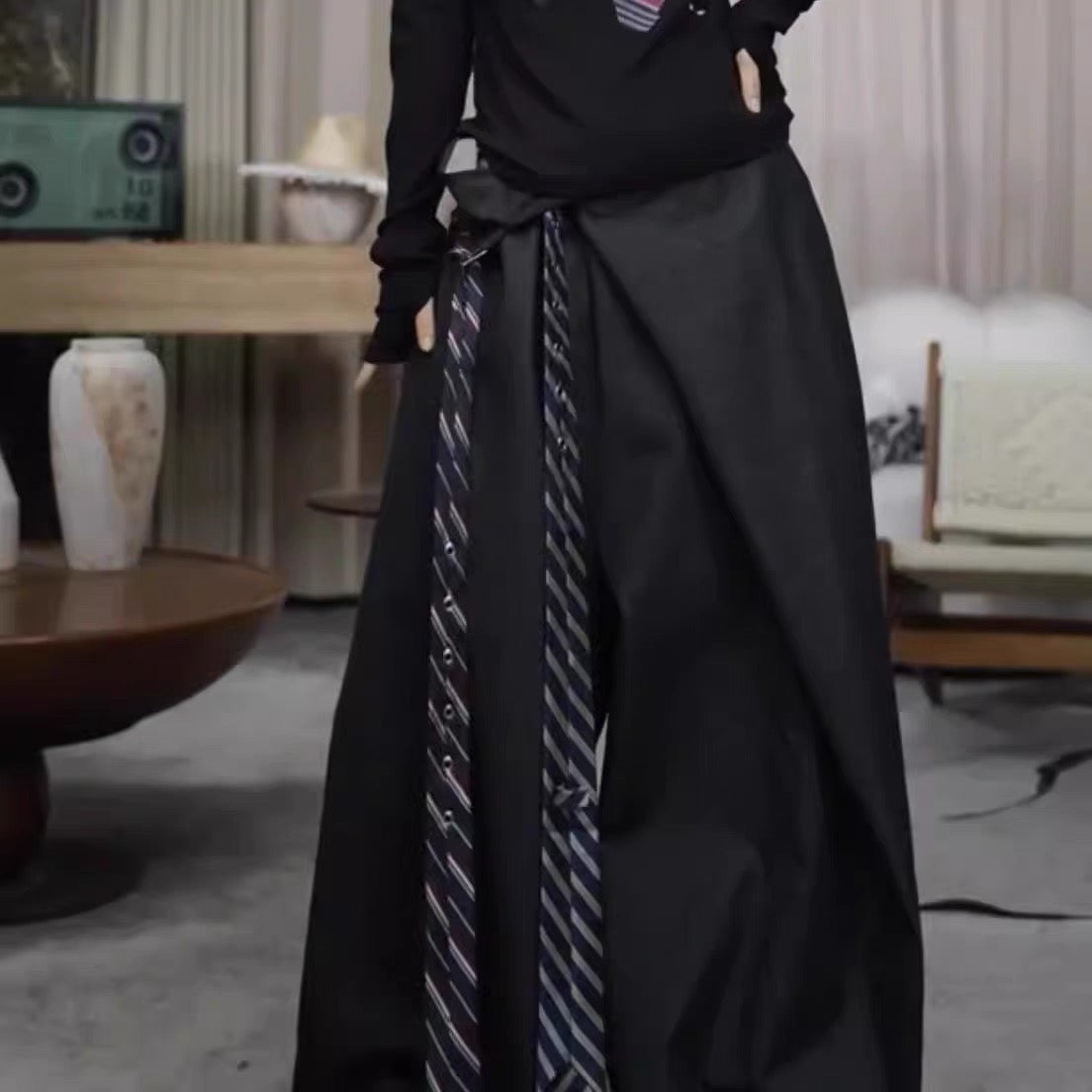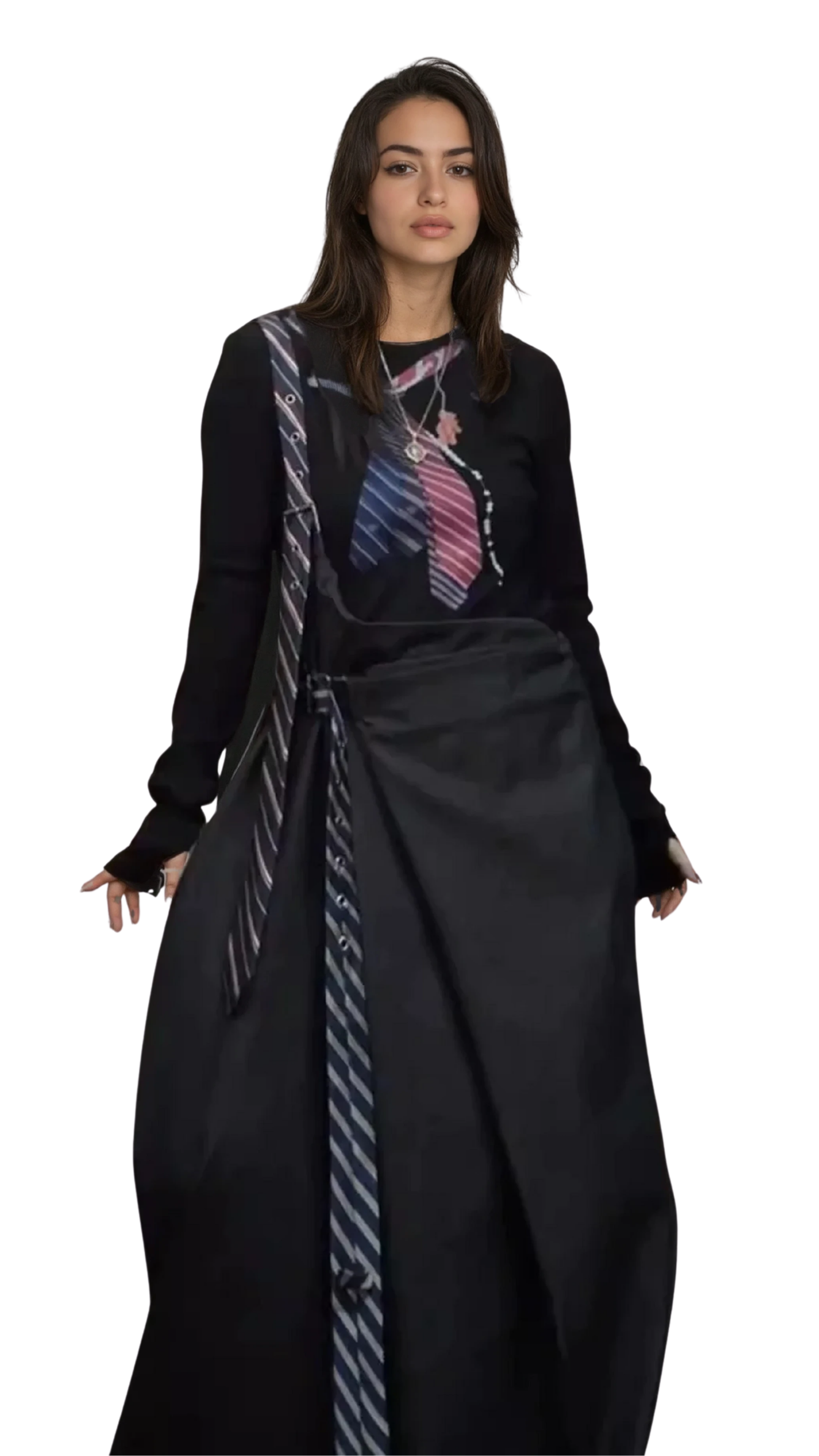 - Design Details: Features an irregular hem and an integrated, contrasting striped tie detail that drapes dramatically for an edgy, asymmetrical look.
