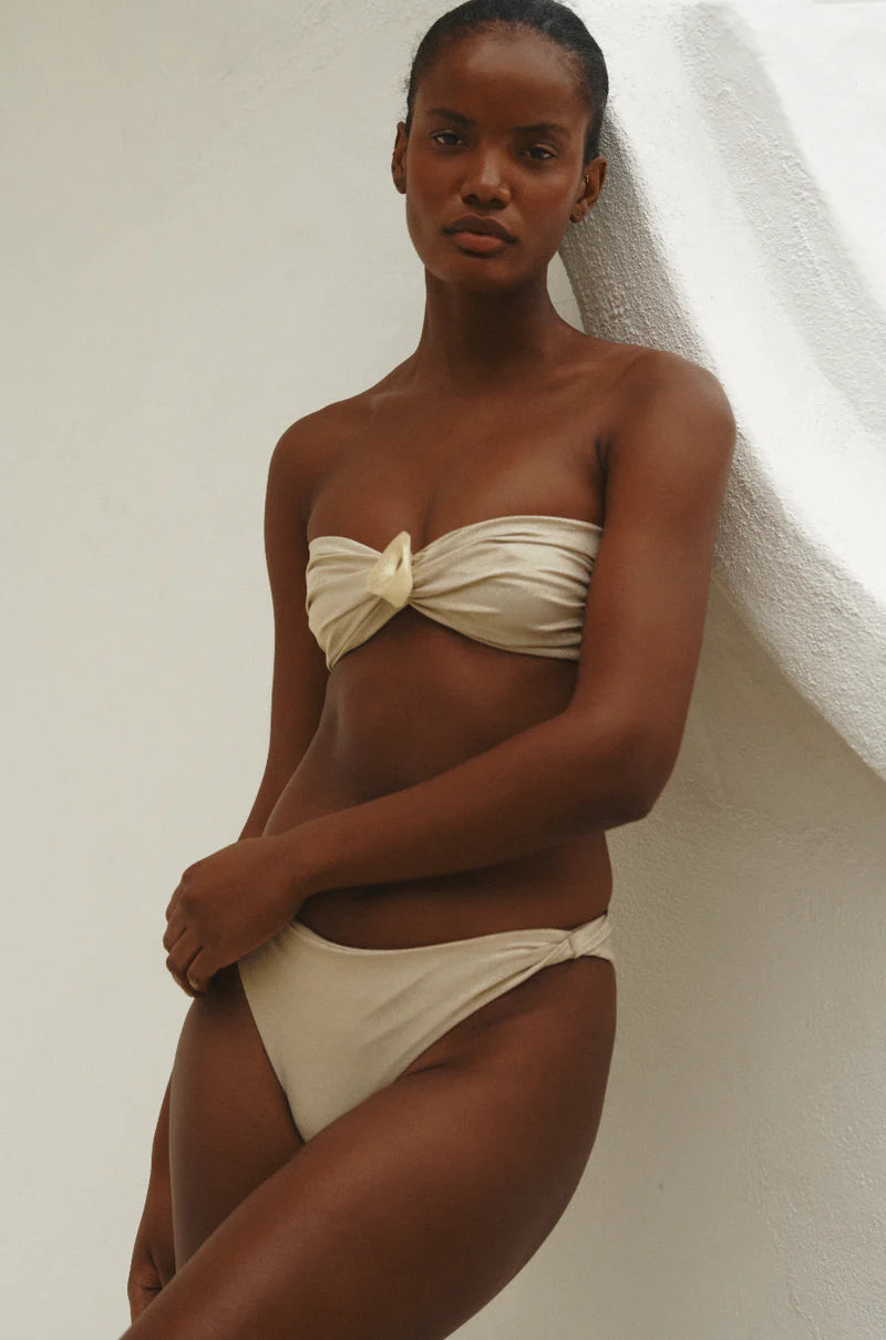 Vera bandeau bikini top features a metallic texture adorned with a center stone detail and offers a hook back closure.