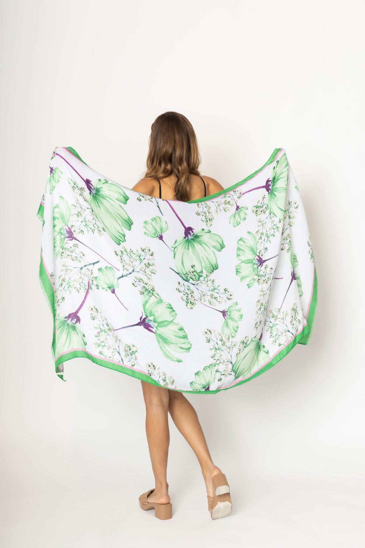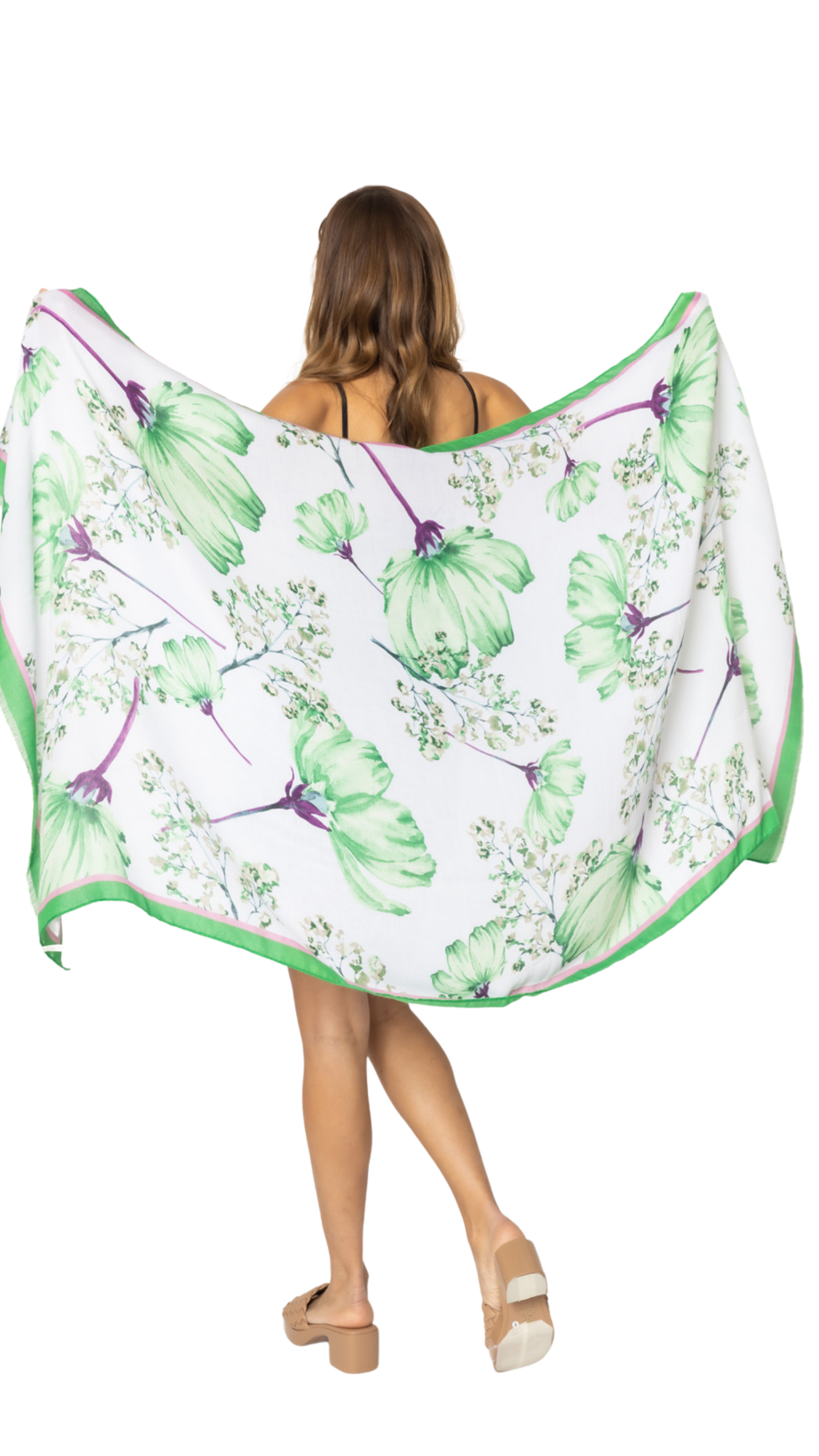 This beautiful scarf features a vibrant floral design, perfect for adding a pop of color to any outfit. Made from 100% polyester, it offers a soft and comfortable feel. The generous size allows for versatile styling options, whether wrapped around the waist as a pareo, draped around the shoulders or wrapped around the neck.