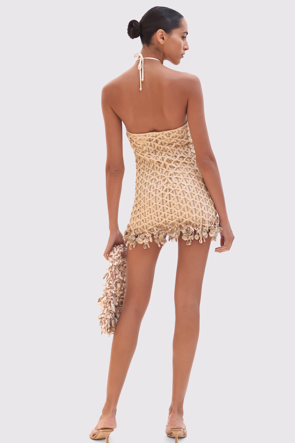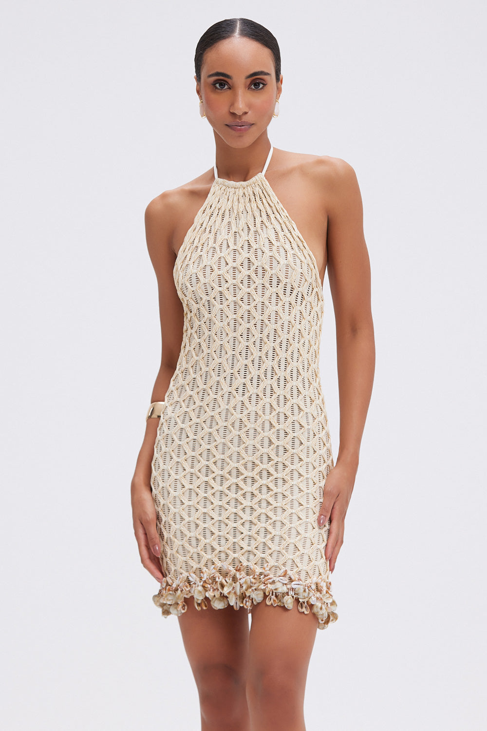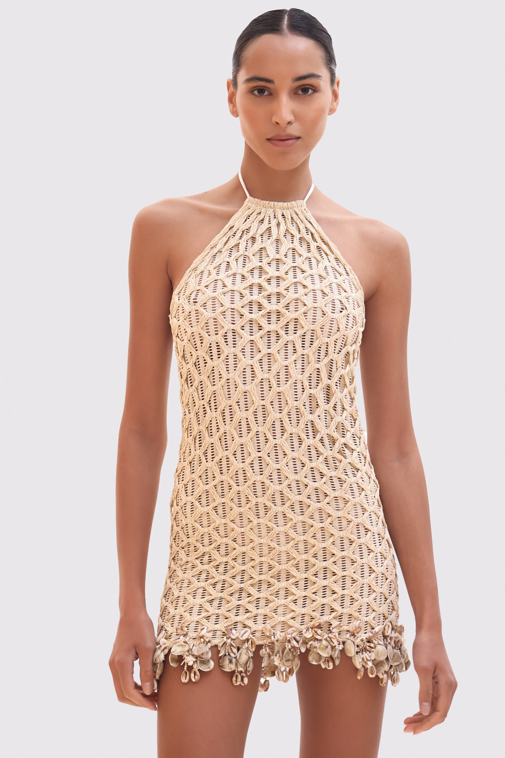 This mini dress features a halterneck line and mesh fabric with a crochet design overlay, hand beaded shell and embellishment design along the hemline. Open design at the top of the back with a tie closure at the neck.