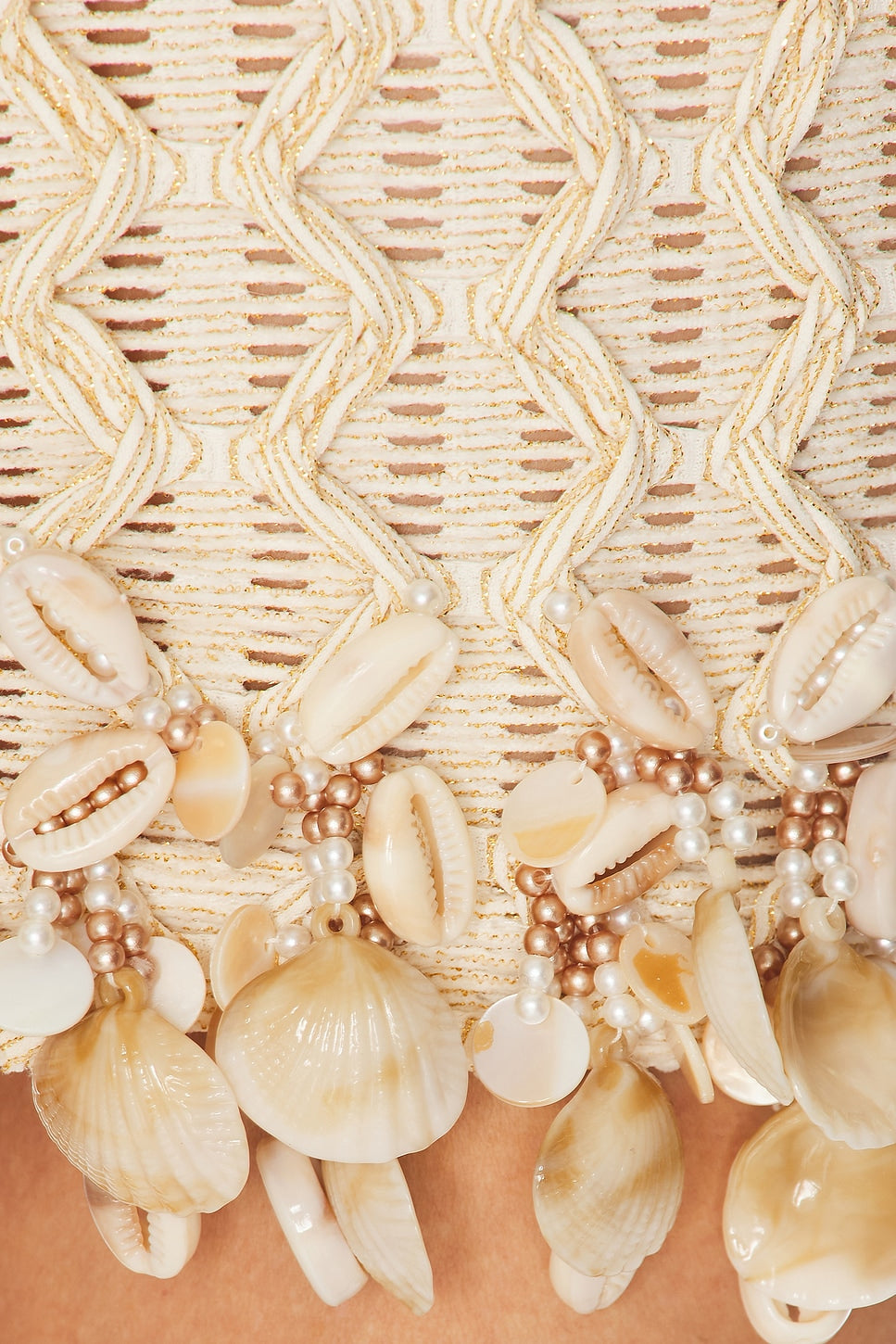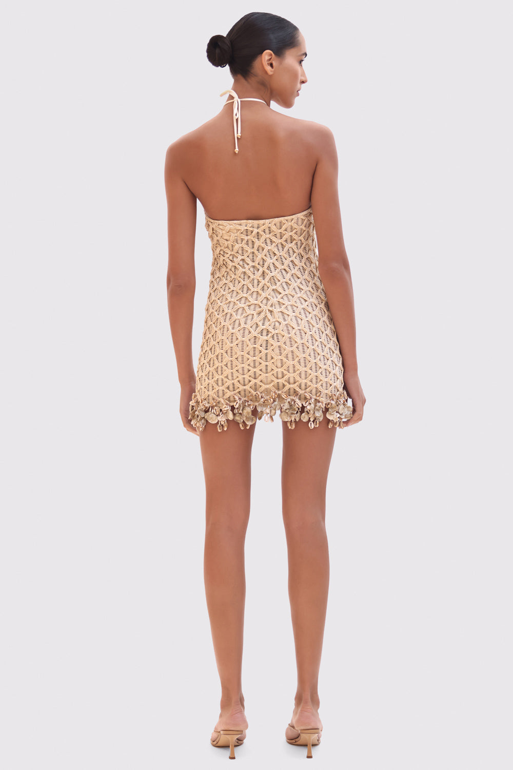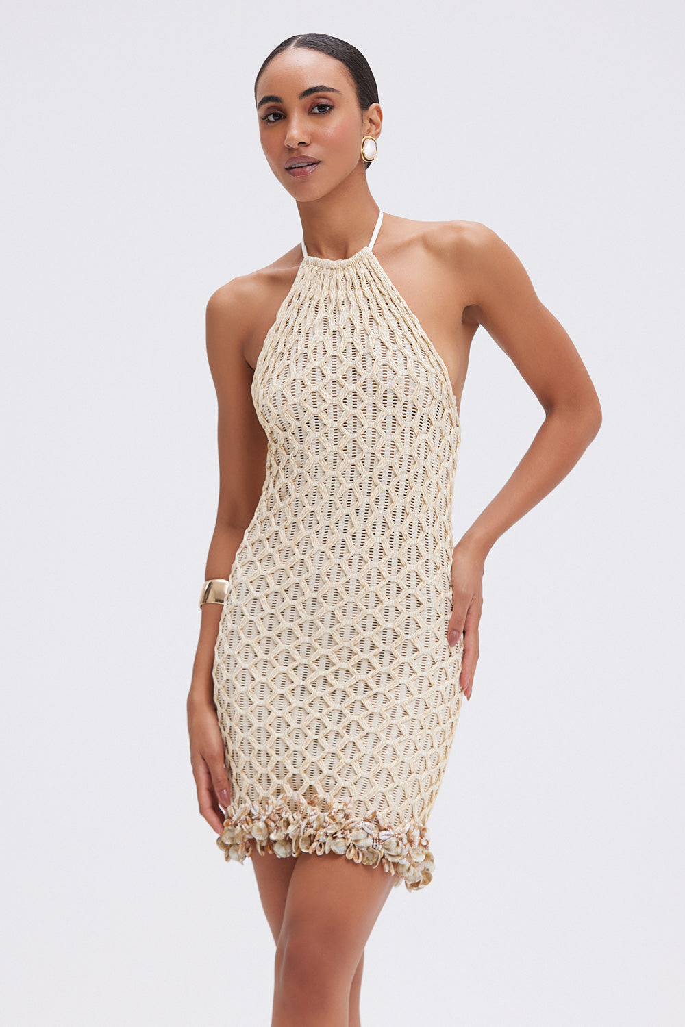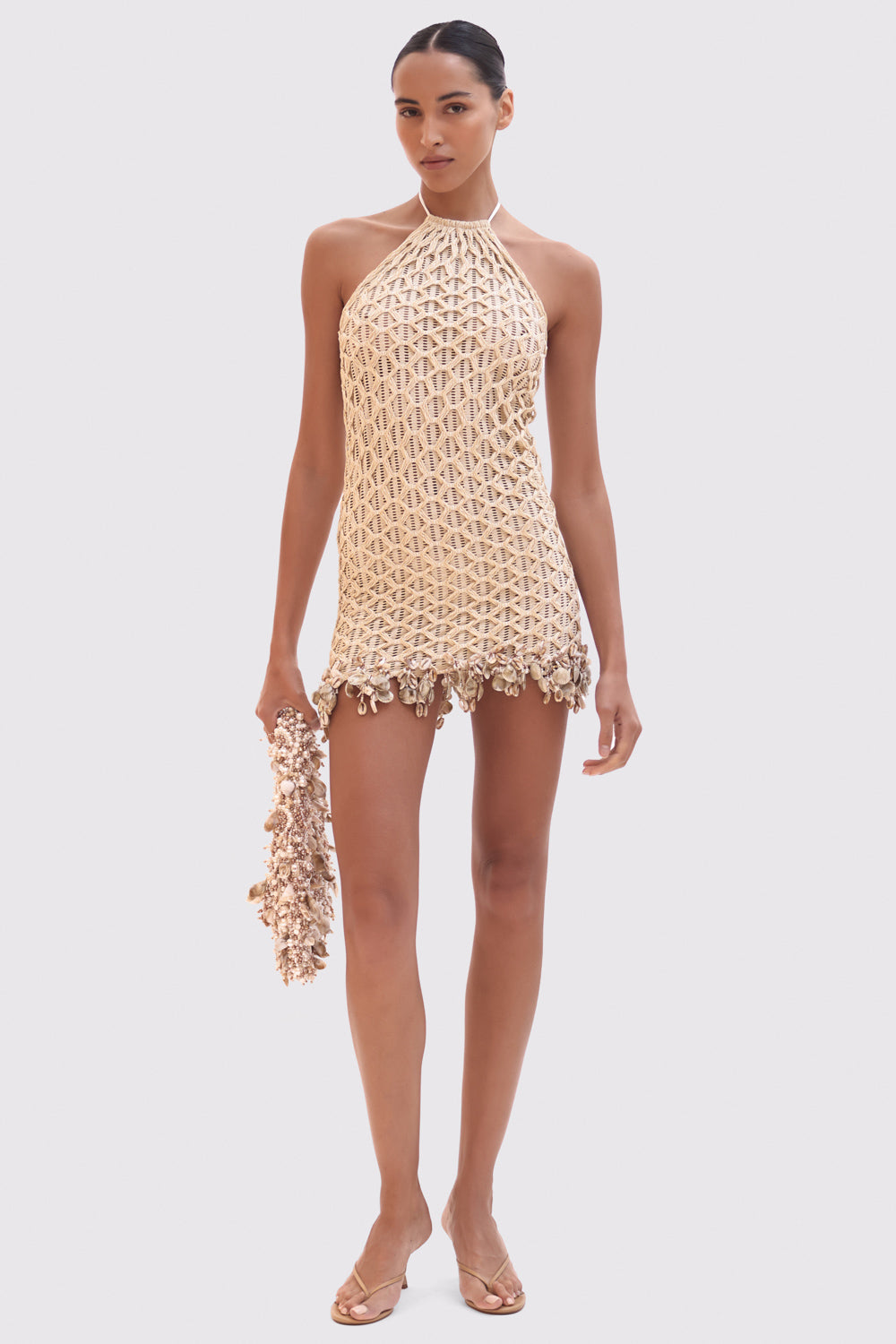 This mini dress features a halterneck line and mesh fabric with a crochet design overlay, hand beaded shell and embellishment design along the hemline. Open design at the top of the back with a tie closure at the neck.