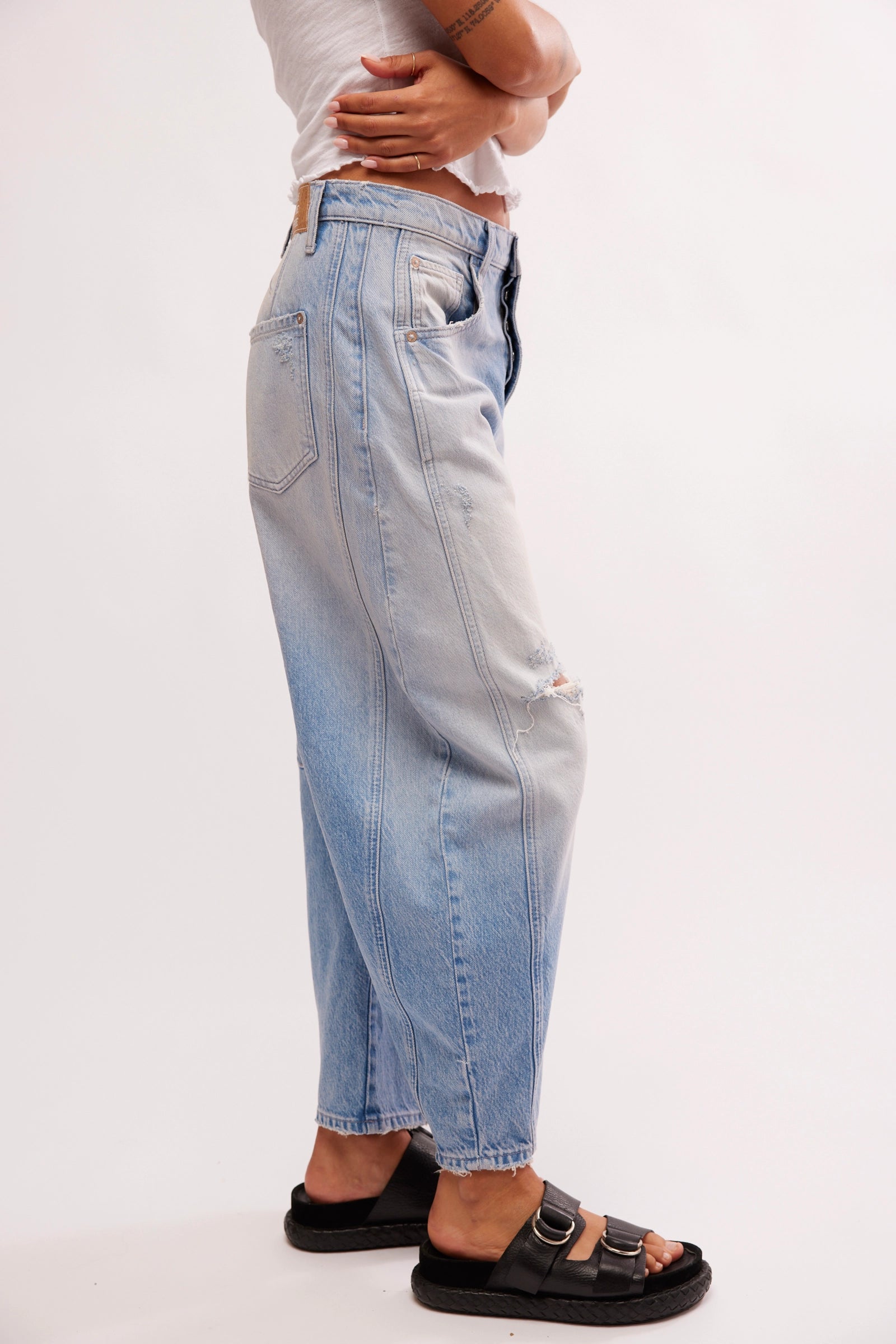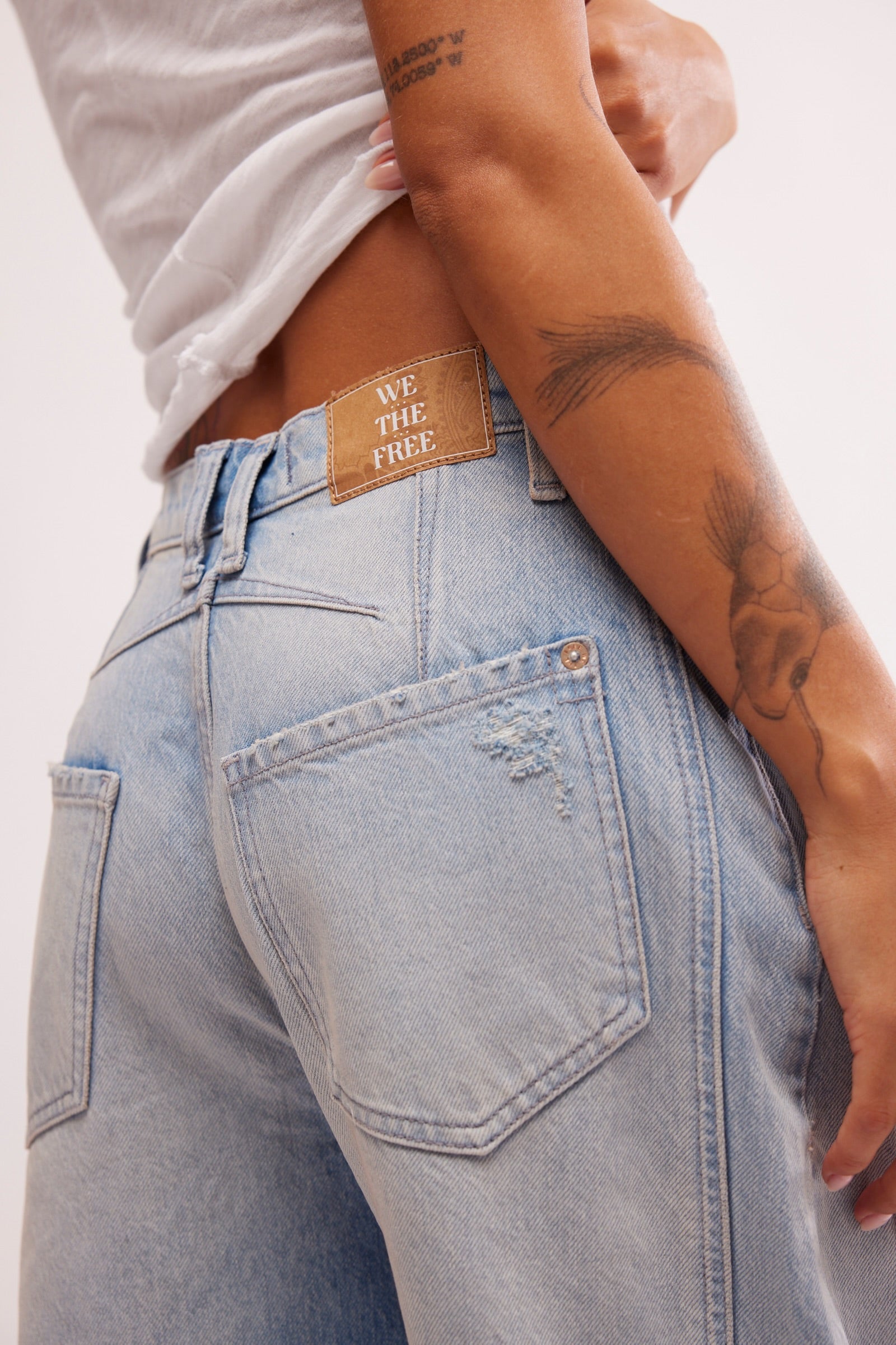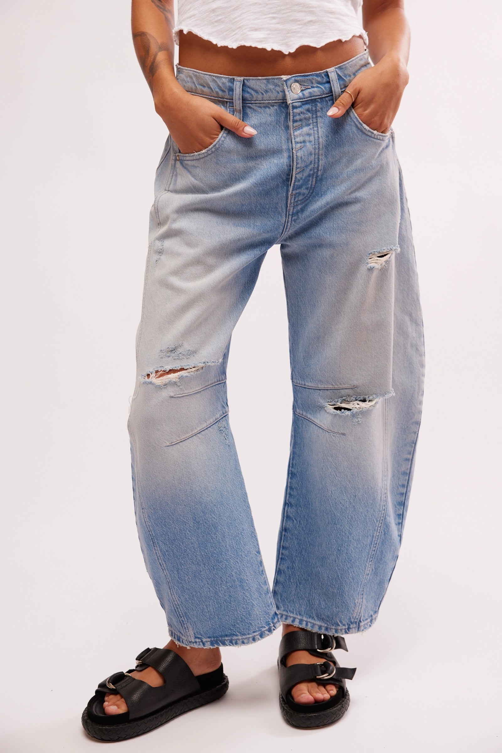 So bold barrel jeans from our We The Free collection featured in a mid-rise fit with subtle distressed detailing and wide-legs that taper at the ankle.