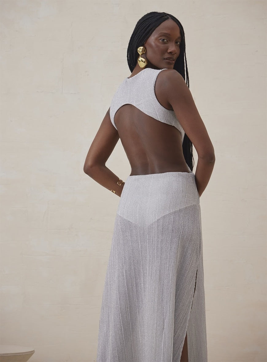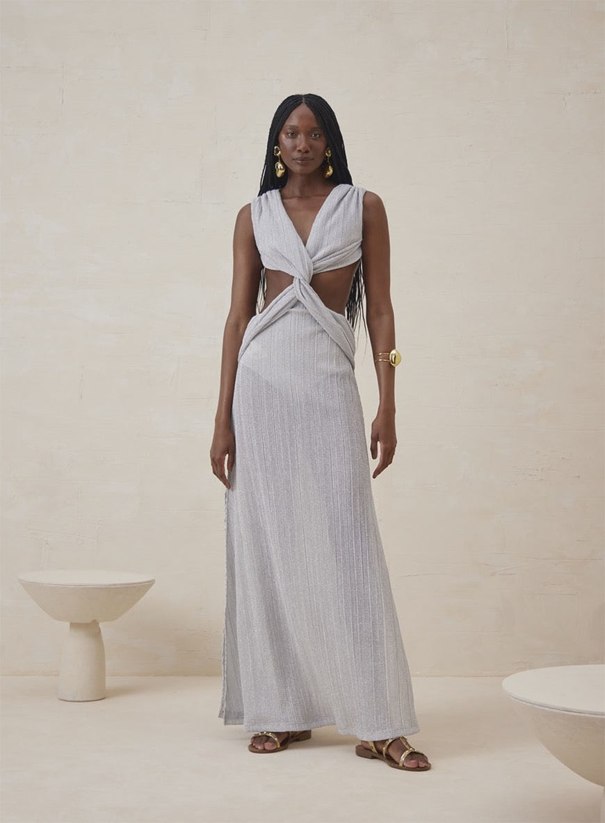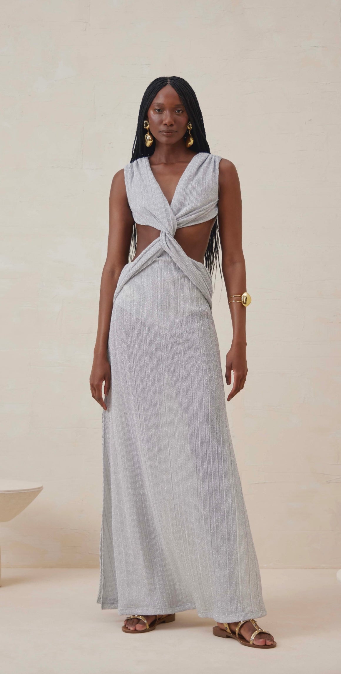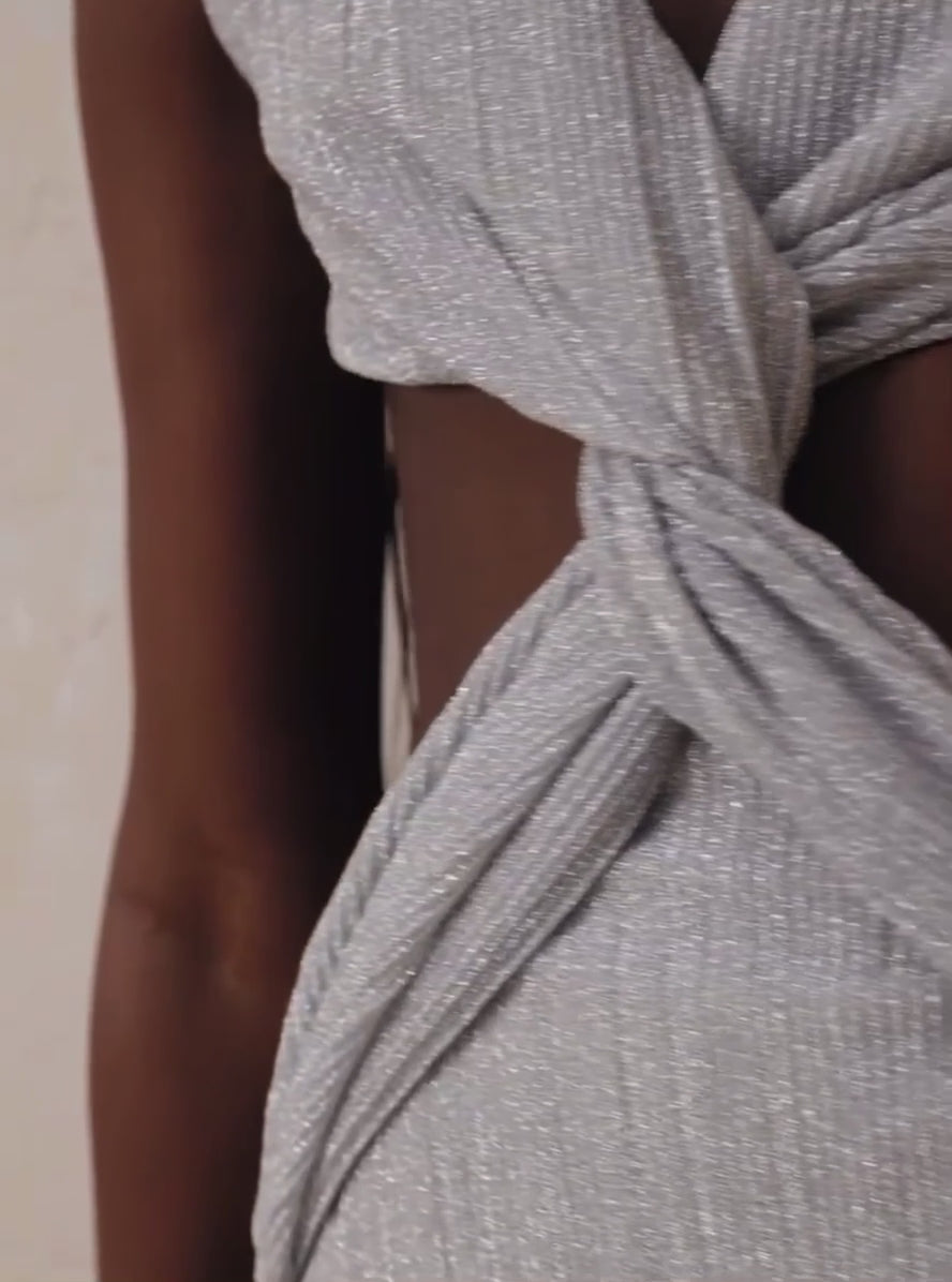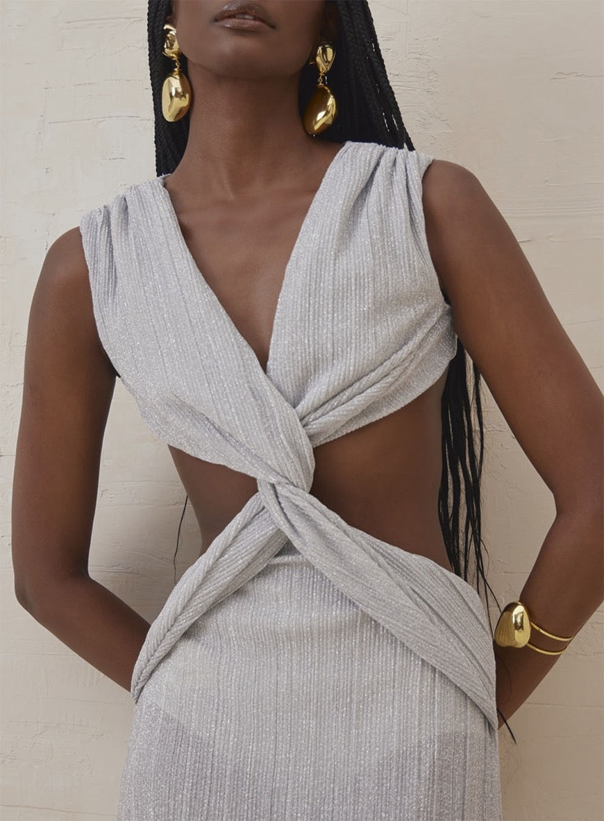 The Yolanda Twist Dress is perfect for those seeking a unique and contemporary style. With its loose fit, it brings a modern and sophisticated approach to women's fashion. Its straight cut with front twist detail offers a relaxed silhouette, making it perfect for occasions when you want to feel distinctive.This dress features a straight shape and loose fit. It boasts a v-neckline, overlaid detail on the shoulder with gathering extending to the waist to form a twist, open back, panty-style lining, snap button closure at the crotch, side slits, and internal satin ribbon hanger loops for added convenience.