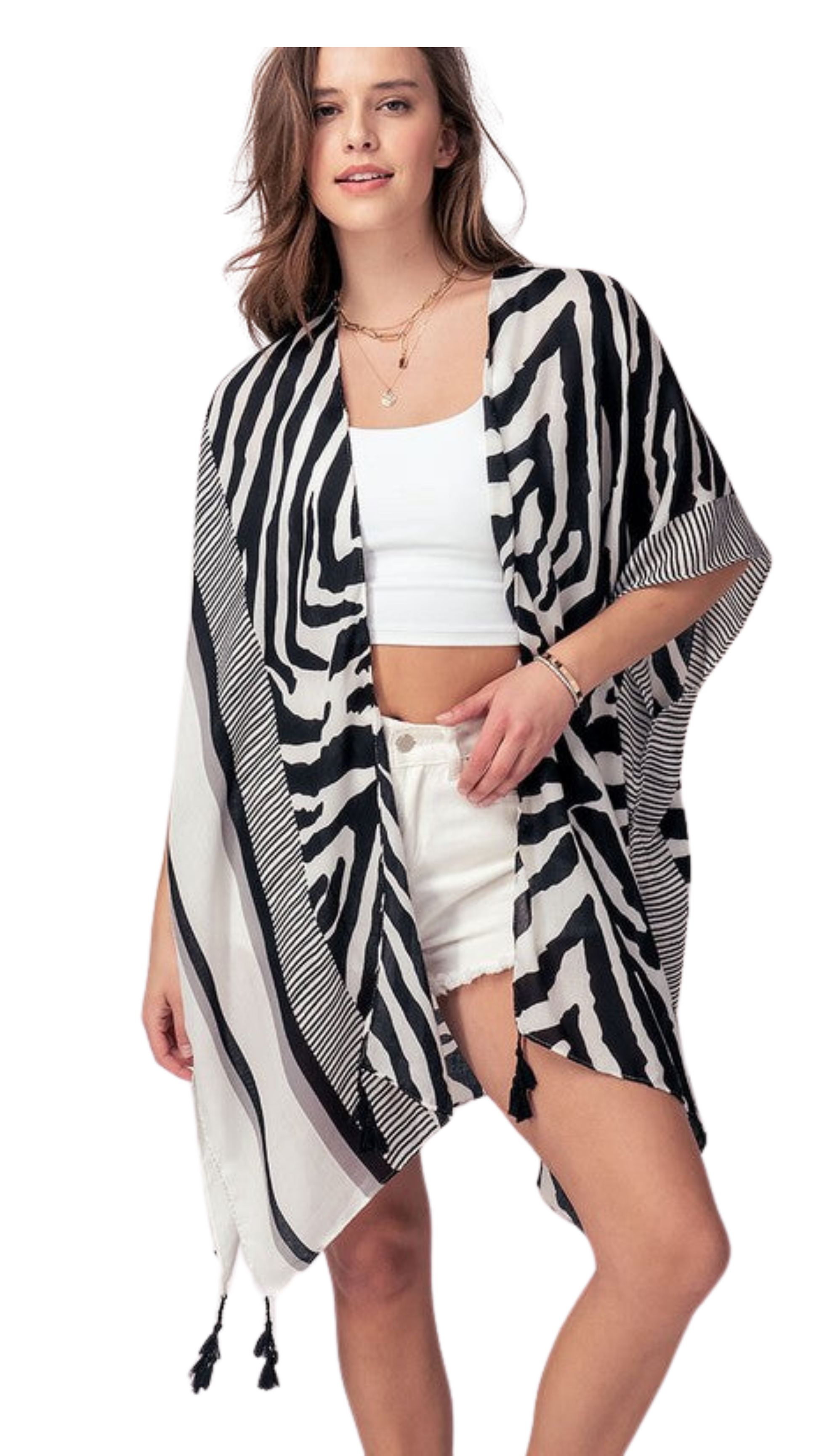 This stylish kimono features a bold zebra print and elegant tassels, making it a versatile addition to your wardrobe. Whether you're layering it over a tee for a casual look or over a swimsuit for a chic beach cover-up, this kimono adds a touch of flair to any outfit. Made from 100% polyester, it ensures comfort and durability.