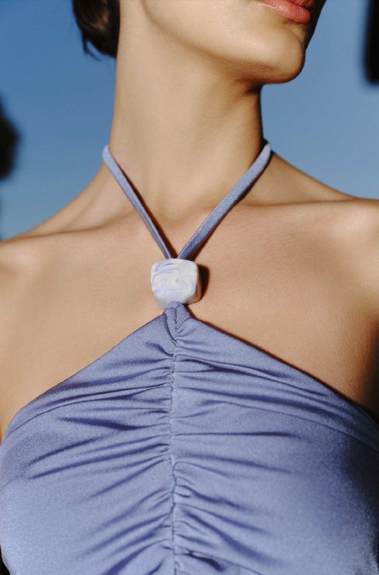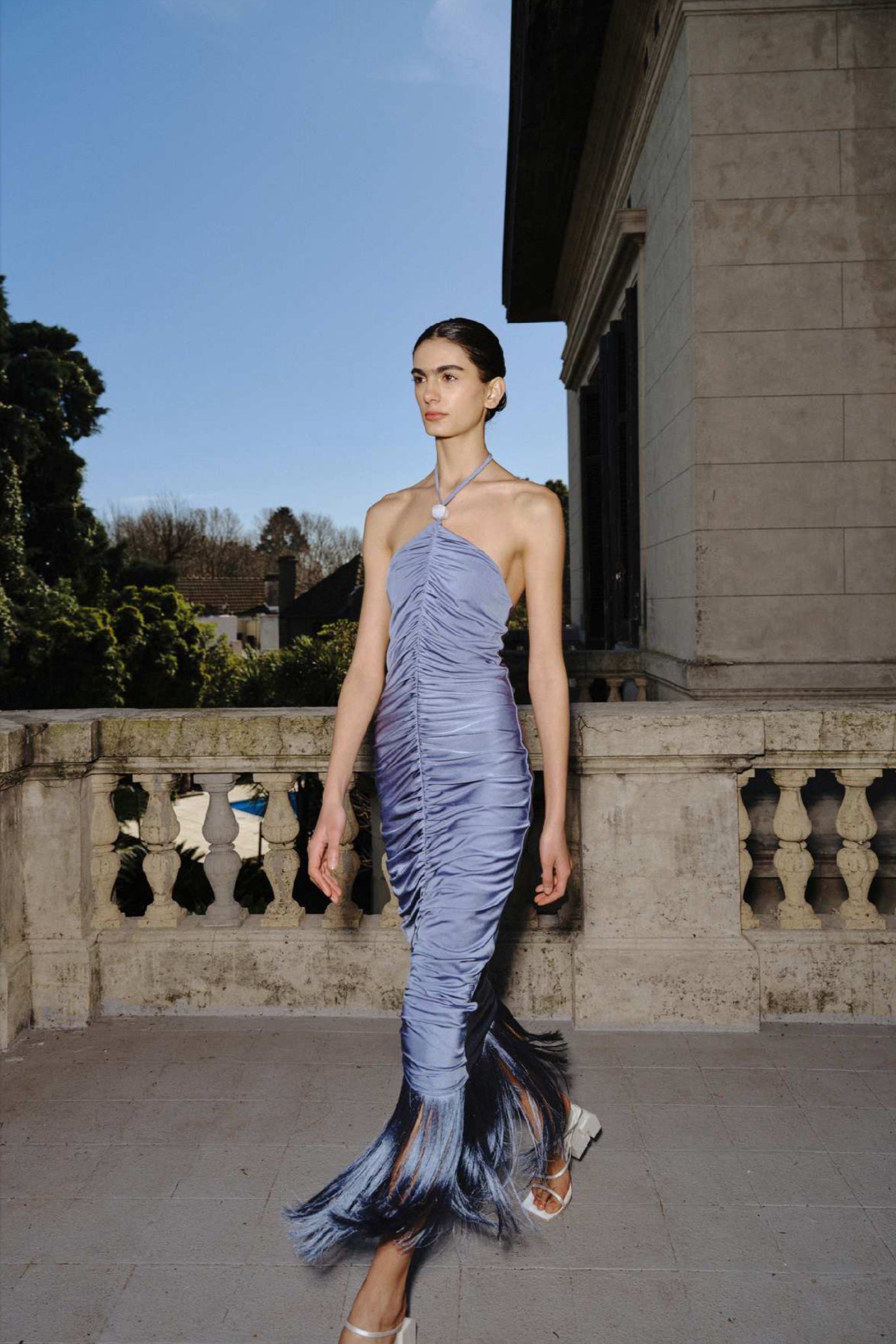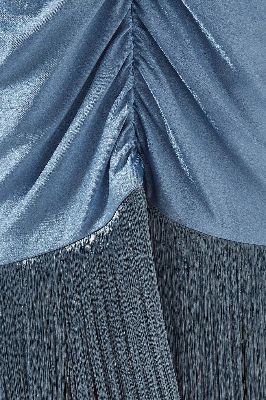 Introducing the "Zoe Dress" in plated – this halter-neck maxi dress features fringes and a ruched design for a flattering, dynamic silhouette. Lined for comfort, it’s the perfect combination of modern elegance and playful texture, making it an ideal choice for a chic, statement-making look.